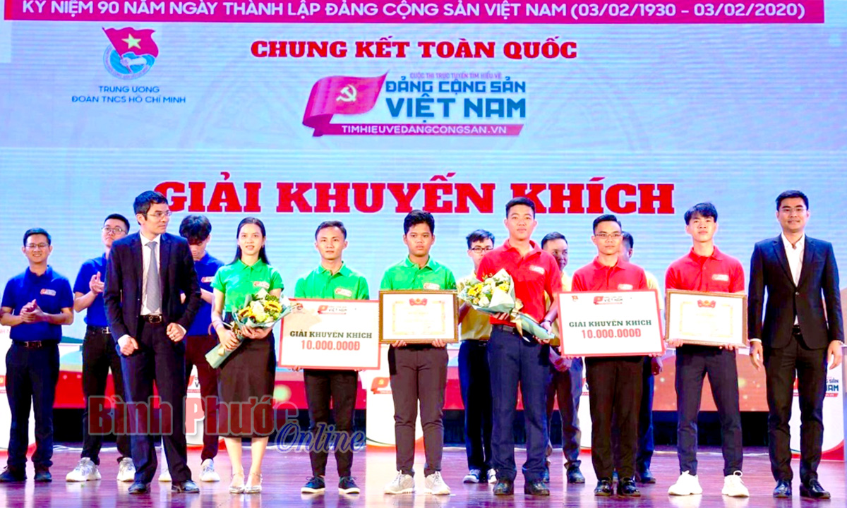Nguyễn Hoài Nam (áo đỏ, thứ 3 từ phải sang) nhận giải trong cuộc thi trực tuyến tìm hiểu về Đảng Cộng sản Việt Nam