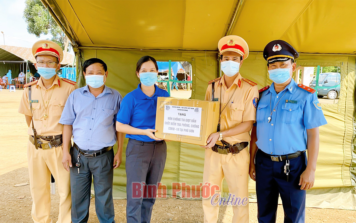 Bí thư huyện Đoàn Đào Thị Quế thăy mặt tuổi trẻ Bù Đăng trao tặng 100 mặt nạ chống tia giọt bắn cho lực lượng tại chốt kiểm soát xã Phú Sơn, huyện Bù Đăng