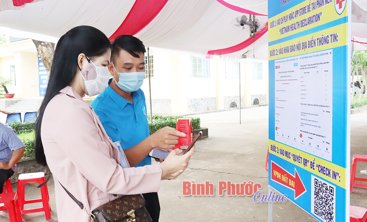 Thanh niên tình nguyện phường Tiến Thành (thành phố Đồng Xoài) hướng dẫn người dân khai báo y tế và cài đặt ứng dụng quét mã QR