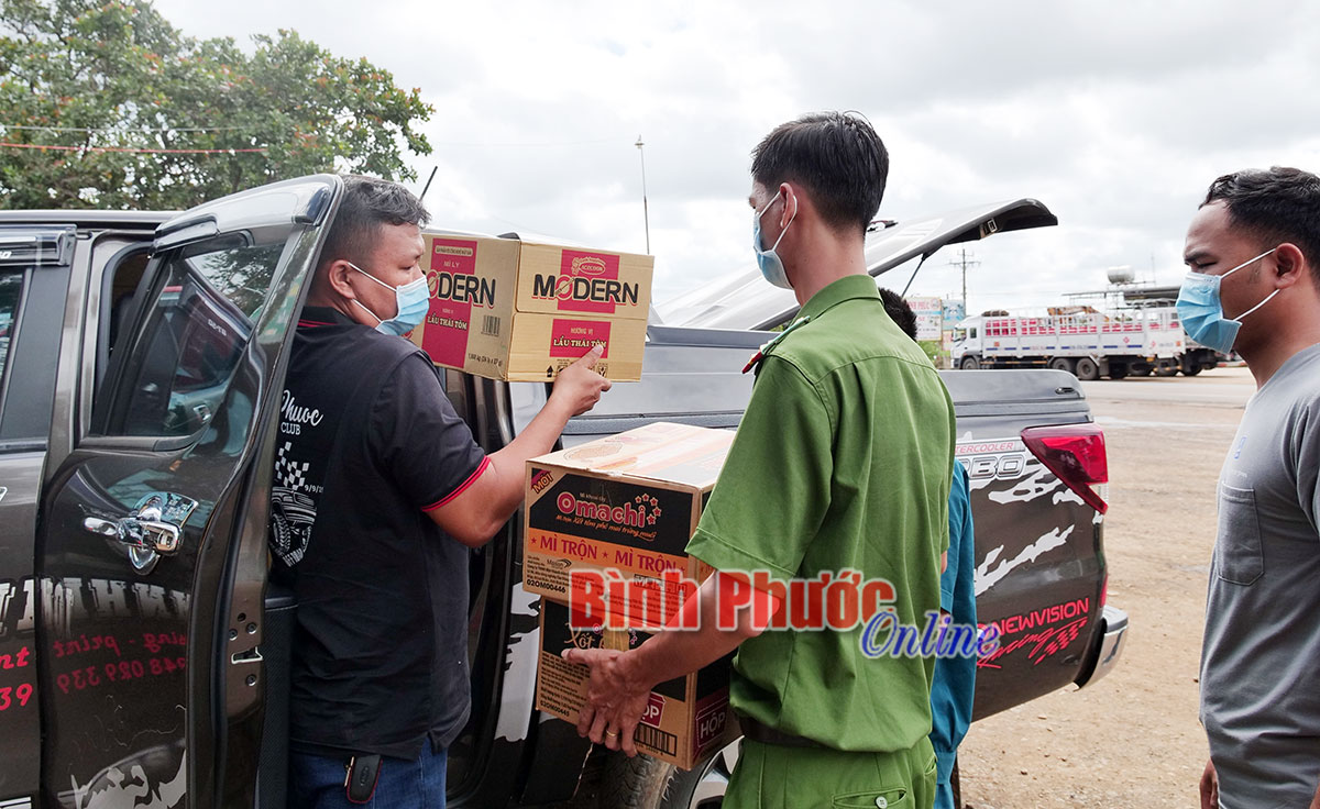 Các thành viên trong đoàn vận chuyển quà vào tặng các chốt kiểm soát giao thông và phòng, chống dịch trên địa bàn huyện Bù Đăng