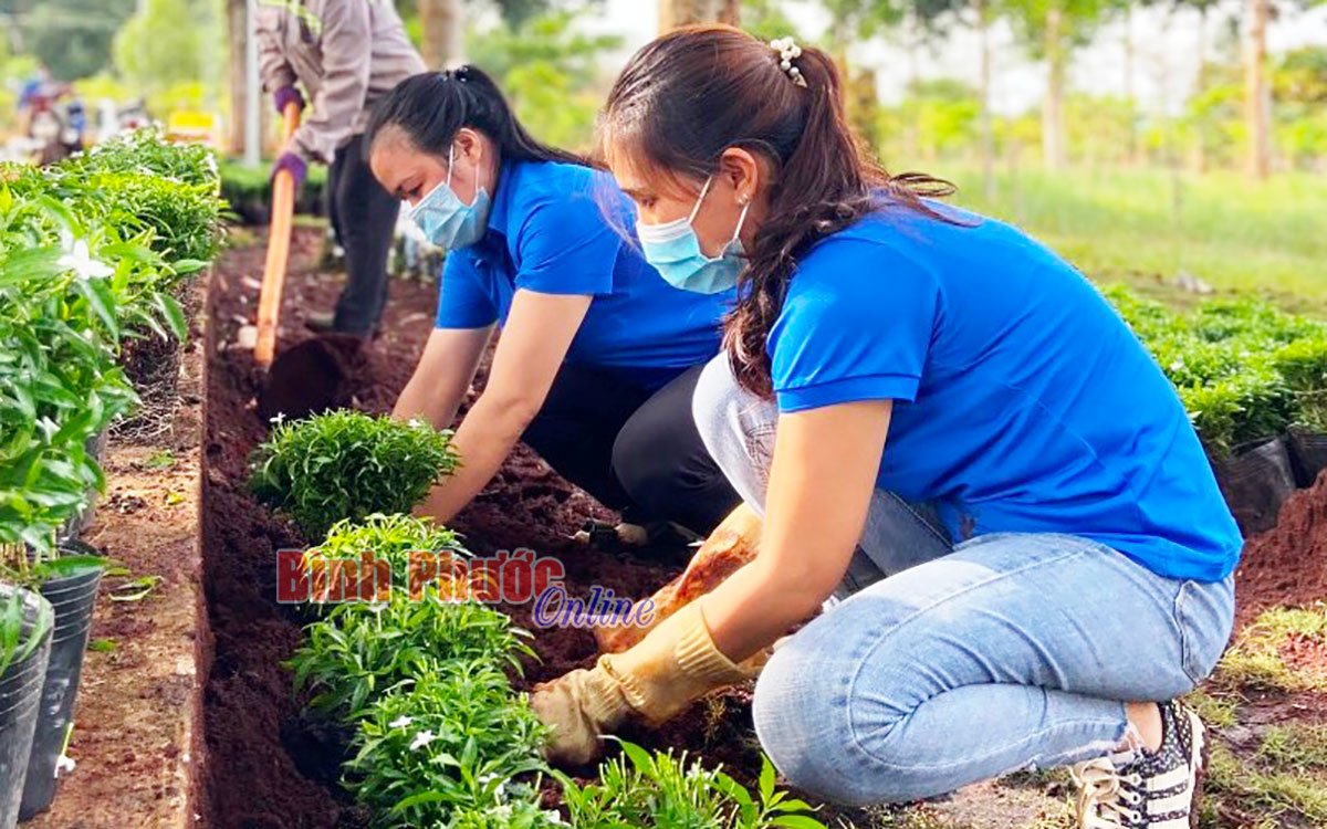ĐVTN thị xã Phước Long góp hàng trăm ngày công lao động để trồng cỏ, chỉnh trang Nghĩa trang liệt sĩ thị xã (ảnh chụp trước ngày thực hiện Chỉ thị 16/CT-TTg)