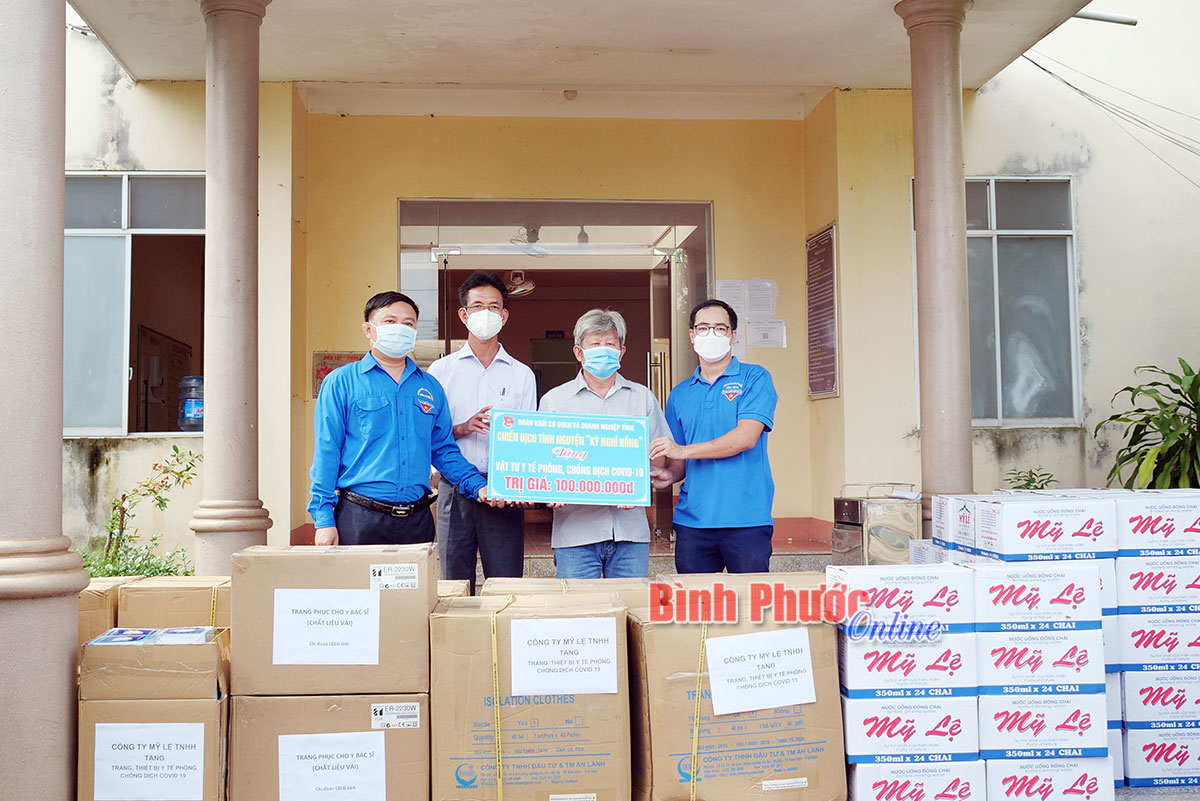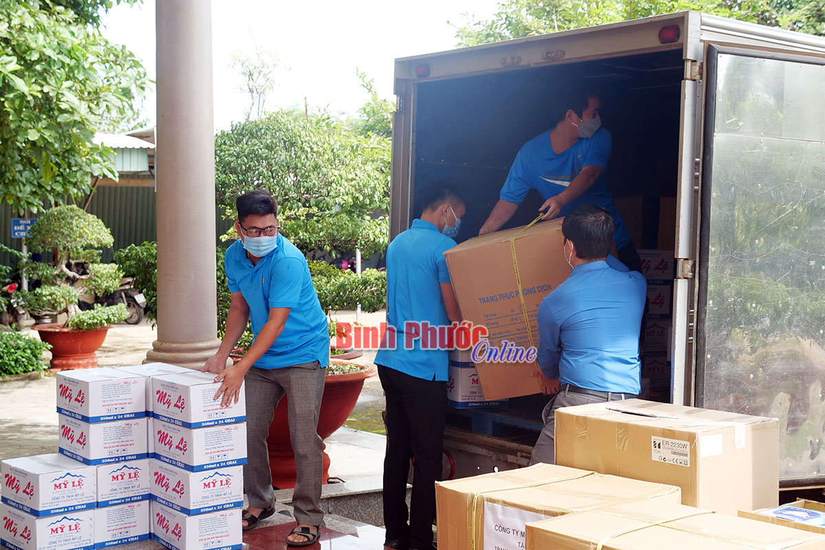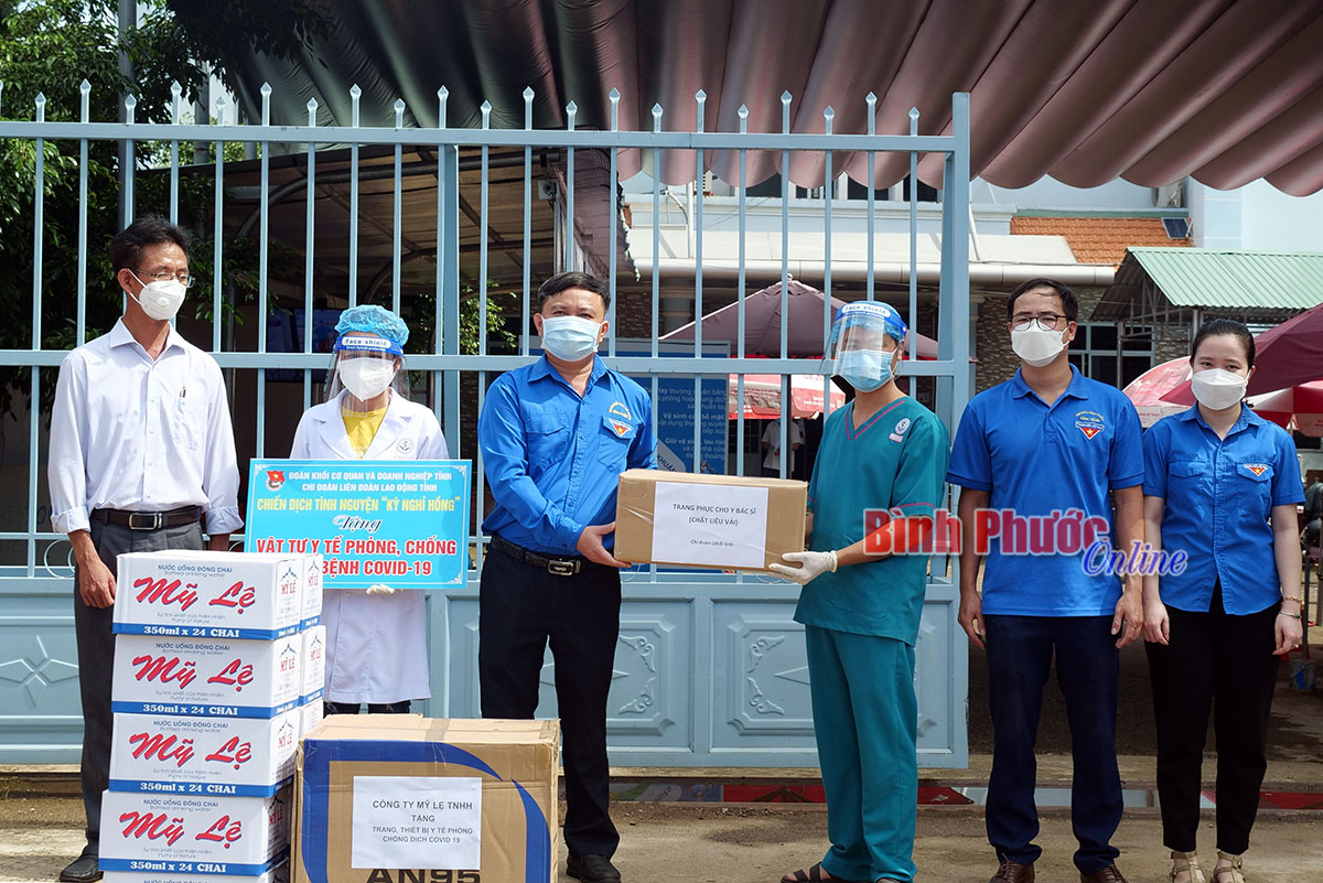Đoàn đã trao tặng 500 bộ đồ bảo hộ cấp 2, 3, trang phục y, bác sĩ; 200 kính chắn giọt bắn; 100 thùng nước suối và 3.600 khẩu trang N95 cho Trung tâm Kiểm soát bệnh tật tỉnh, Ban Bảo vệ chăm sóc sức khỏe cán bộ tỉnh và các khu cách ly tập trung trên địa bàn thành phố Đồng Xoài.