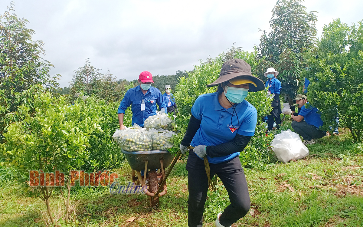 Đoàn viên thanh niên, học sinh, sinh viên và giáo viên xã Nghĩa Trung, huyện Bù Đăng hỗ trợ nông dân thu hoạch nông sản trong thời gian giãn cách xã hội