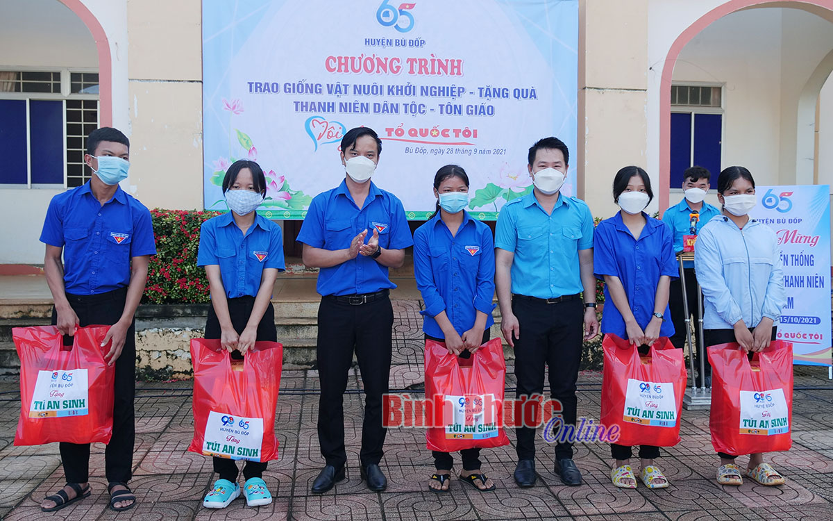 Dịp này, thực hiện hành trình “Tôi yêu Tổ quốc tôi”, Hội LHTN Việt Nam huyện Bù Đốp cũng trao tặng giống vật nuôi khởi nghiệp cho thanh niên thuộc các xã Phước Thiện, Tân Tiến, Thanh Hòa, trị giá 32 triệu đồng. Thông qua các hoạt động nhằm kịp thời hỗ trợ thanh niên và người dân khó khăn vượt qua đại dịch Covid-19.