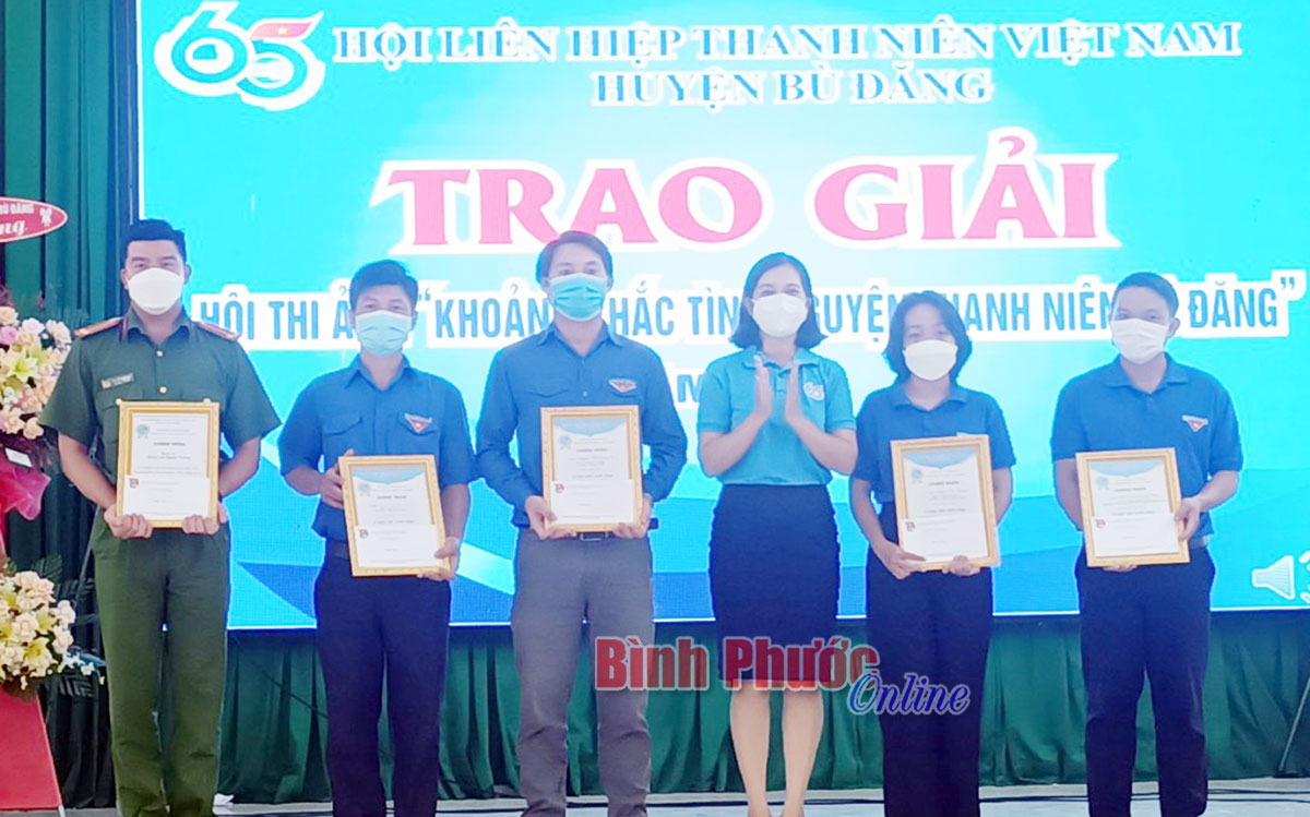 Chị Đào Thị Quế, Bí thư Huyện đoàn, Chủ tịch Hội Liên hiệp Thanh niên huyện Bù Đăng (thứ 3, từ phải qua) trao giải cho các cá nhân đạt giải trong hội thi “Khoảng khắc tình nguyện thanh niên Bù Đăng” năm 2021