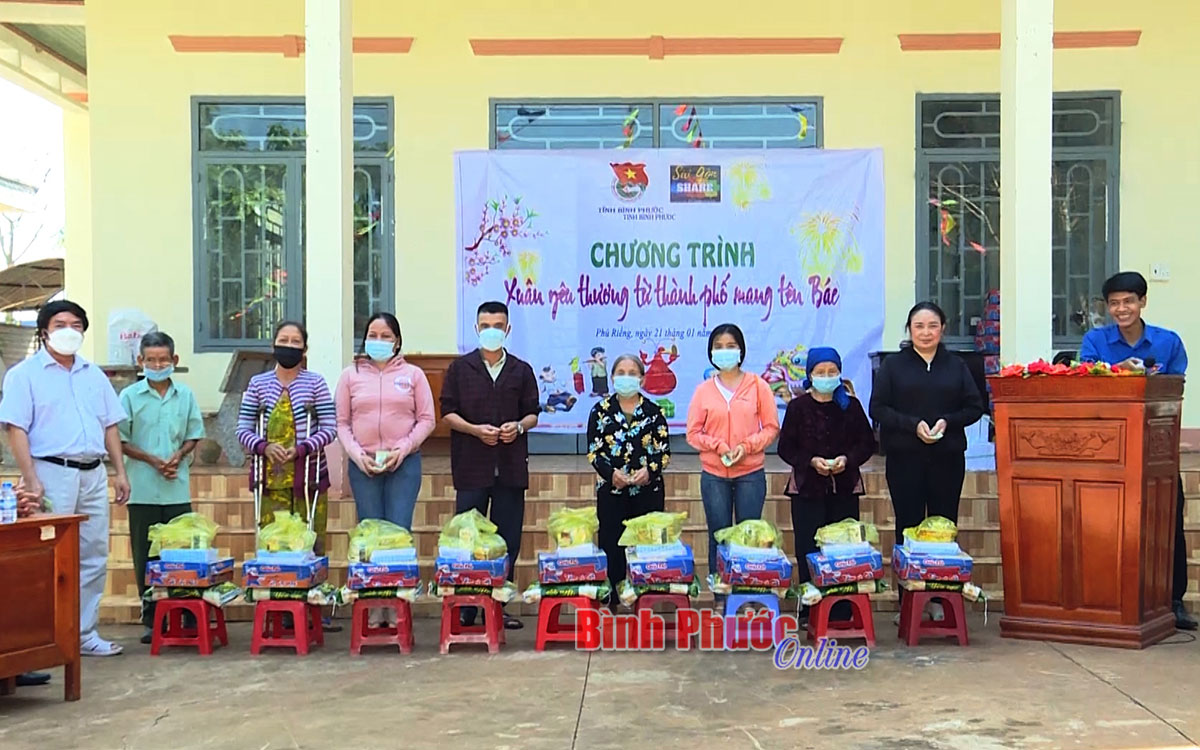 Dịp này, 100 phần quà, mỗi phần trị giá 500 ngàn đồng gồm nhu yếu phẩm và tiền mặt đã trao cho người nghèo, có hoàn cảnh khó khăn trên địa bàn 2 xã được Tỉnh đoàn vận động từ Câu lạc bộ Sài Gòn Share. Những phần quà nhỏ nhưng đong đầy tình nghĩa, giúp người dân vơi bớt khó khăn, đón một cái tết cổ truyền đầm ấm, ý nghĩa.