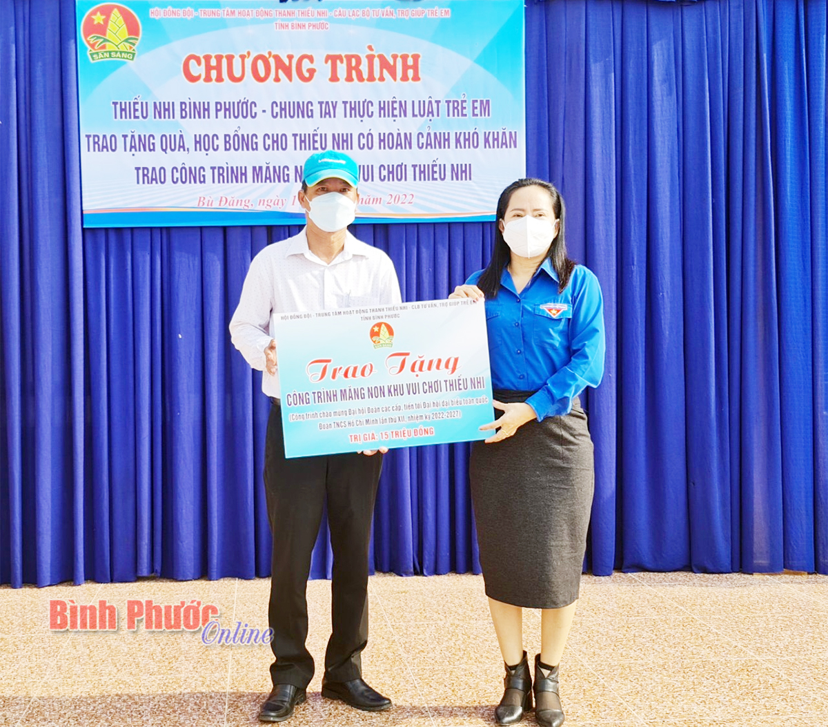 Tại chương trình, các đơn vị đã trao tặng biểu trưng công trình măng non khu vui chơi thiếu nhi trị giá 15 triệu đồng cho Ban giám hiệu Trường tiểu học Xuân Hồng, xã Bình Minh. Công trình hoàn thành sẽ góp phần tạo không gian văn hóa vui chơi, giải trí, rèn luyện thể chất bổ ích cho trẻ em.