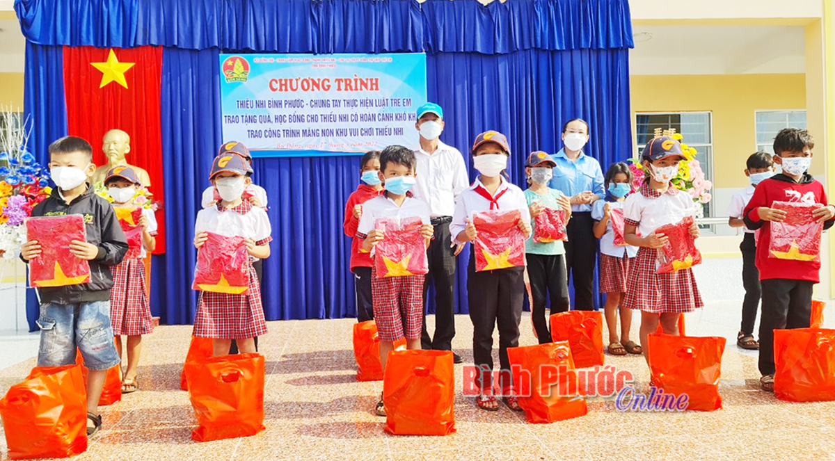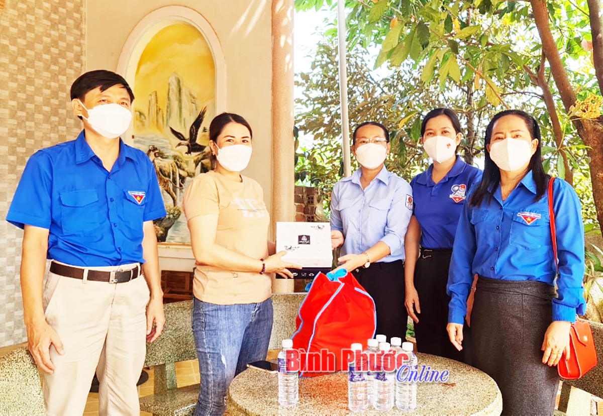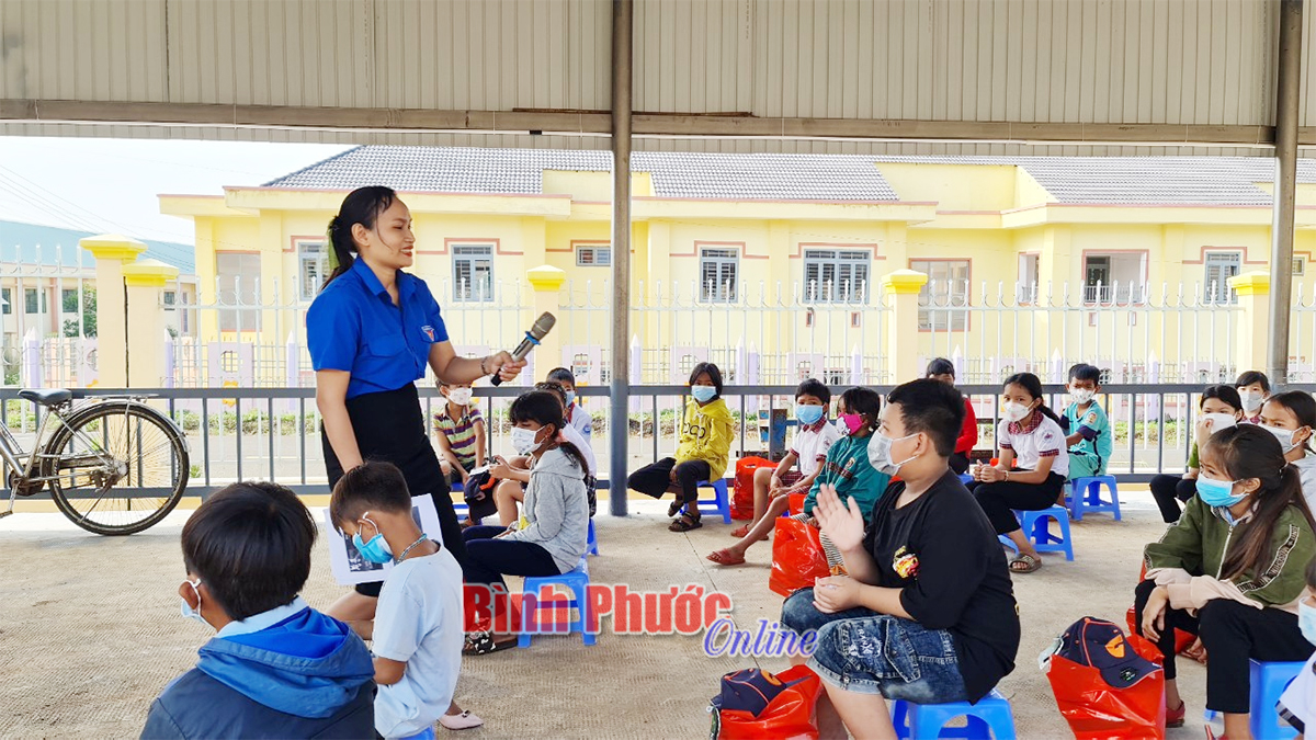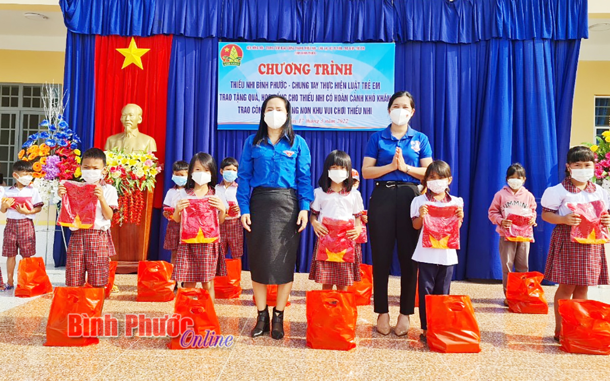 Đoàn trao tặng 50 phần quà cho các em thiếu nhi khó khăn thuộc 2 trường Tiểu học Xuân Hồng, xã Bình Minh và Nguyễn Bá Ngọc, xã Minh Hưng, huyện Bù Đăng. Mỗi phần quà trị giá 300 ngàn đồng, gồm áo thun, tập trắng, nước khử khuẩn và nhu yếu phẩm