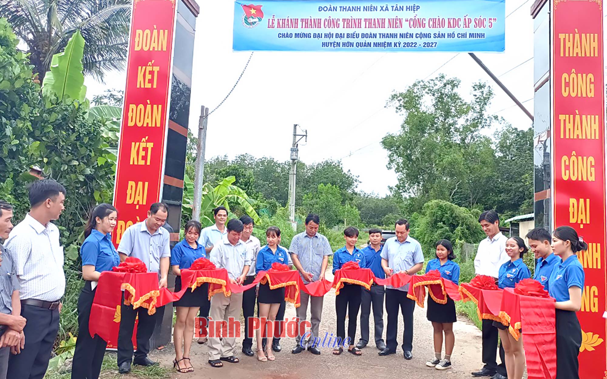 Phó bí thư Thường trực Huyện ủy Hớn Quản Vũ Xuân Trường cùng lãnh đạo Ban Dân vận Huyện ủy, Huyện đoàn, chính quyền và nhân dân xã Tân Hiệp cắt băng khánh thành công trình thanh niên “Cổng chào khu dân cư” ấp Sóc 5