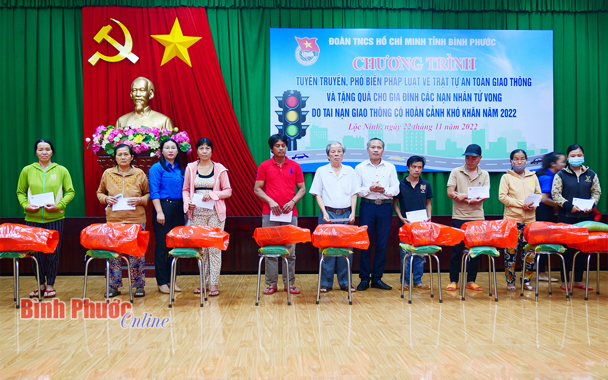 Nhằm chia sẻ những khó khăn, mất mát to lớn về vật chất và tinh thần với các gia đình có người tử vong do TNGT, Tỉnh đoàn Bình Phước đã trao tặng 20 phần quà cho 20 gia đình có người thân tử vong do TNGT, có hoàn cảnh đặc biệt khó khăn trên địa bàn huyện Lộc Ninh. Những phần quà tuy nhỏ, nhưng thể hiện sự sẻ chia, quan tâm của tổ chức đoàn, qua đó kịp thời động viên các gia đình vượt qua nỗi đau, vươn lên trong cuộc sống. “Con tôi bị TNGT dẫn đến tử vong. Chỉ vì quên gạt chống xe khi tham gia giao thông mà cháu mất đi sinh mạng. Tôi cũng mong các cháu nhỏ và người dân khi tham gia giao thông cần tuân thủ Luật Giao thông đường bộ” - bà Nguyễn Thị Na ở xã Lộc Thái chia sẻ.