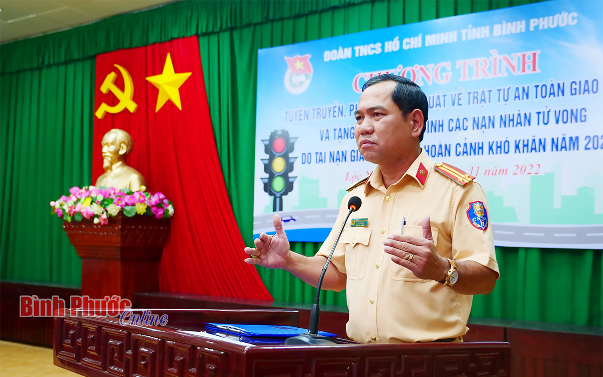Trung tá Trần Thanh Quyền, Đội trưởng Đội Cảnh sát giao thông, Công an huyện Lộc Ninh tuyên truyền luật giao thông