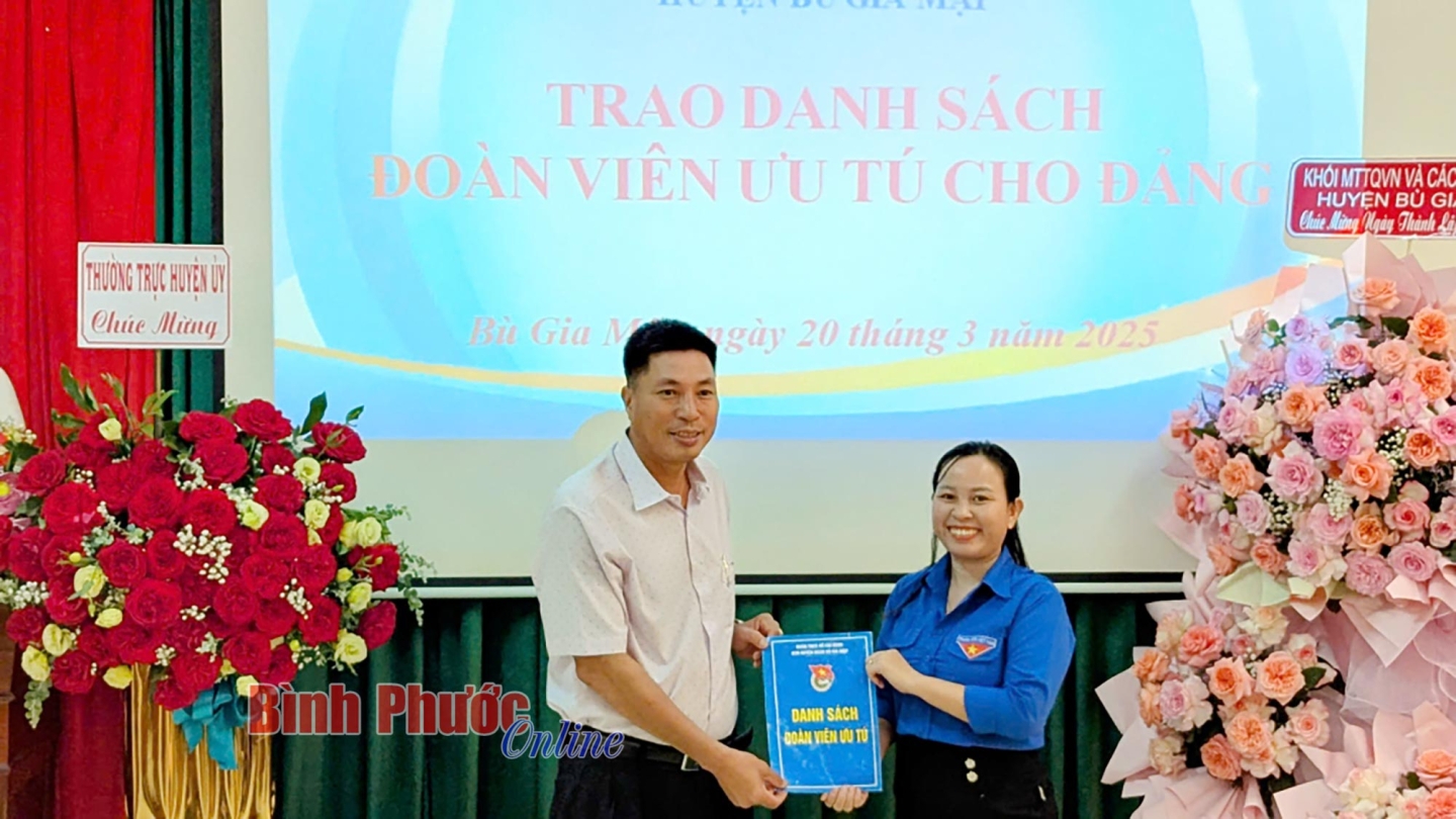 Hằng năm, tổ chức đoàn thanh niên huyện Bù Gia Mập giới thiệu cho Đảng khoảng 70 đoàn viên ưu tú. Năm 2024, các tổ chức đảng của Đảng bộ huyện Bù Gia Mập đã kết nạp 52 đoàn viên thanh niên ưu tú ở các đơn vị từ cơ quan nhà nước, trường học đến thanh niên nông thôn. Riêng trong Tháng thanh niên năm 2025, Huyện đoàn Bù Gia Mập đã tuyên dương 20 đảng viên trẻ tiêu biểu toàn huyện. |