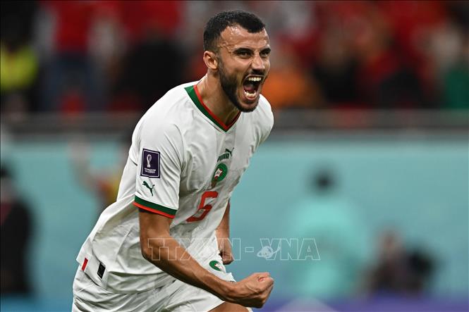 Tiền vệ Abdelhamid Sabiri sau khi sút phạt ghi bàn giúp Maroc vượt lên dẫn trước Bỉ 1 - 0. Ảnh: AFP/TTXVN