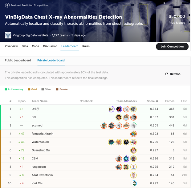 Cuộc thi ''Ứng dụng AI phát hiện điểm bất thường trên ảnh X-quang lồng ngực'' do Viện Nghiên cứu Dữ liệu lớn VinBigdata - Tập đoàn Vingroup tổ chức trên Kaggle, sân chơi uy tín dành cho cộng đồng khoa học dữ liệu