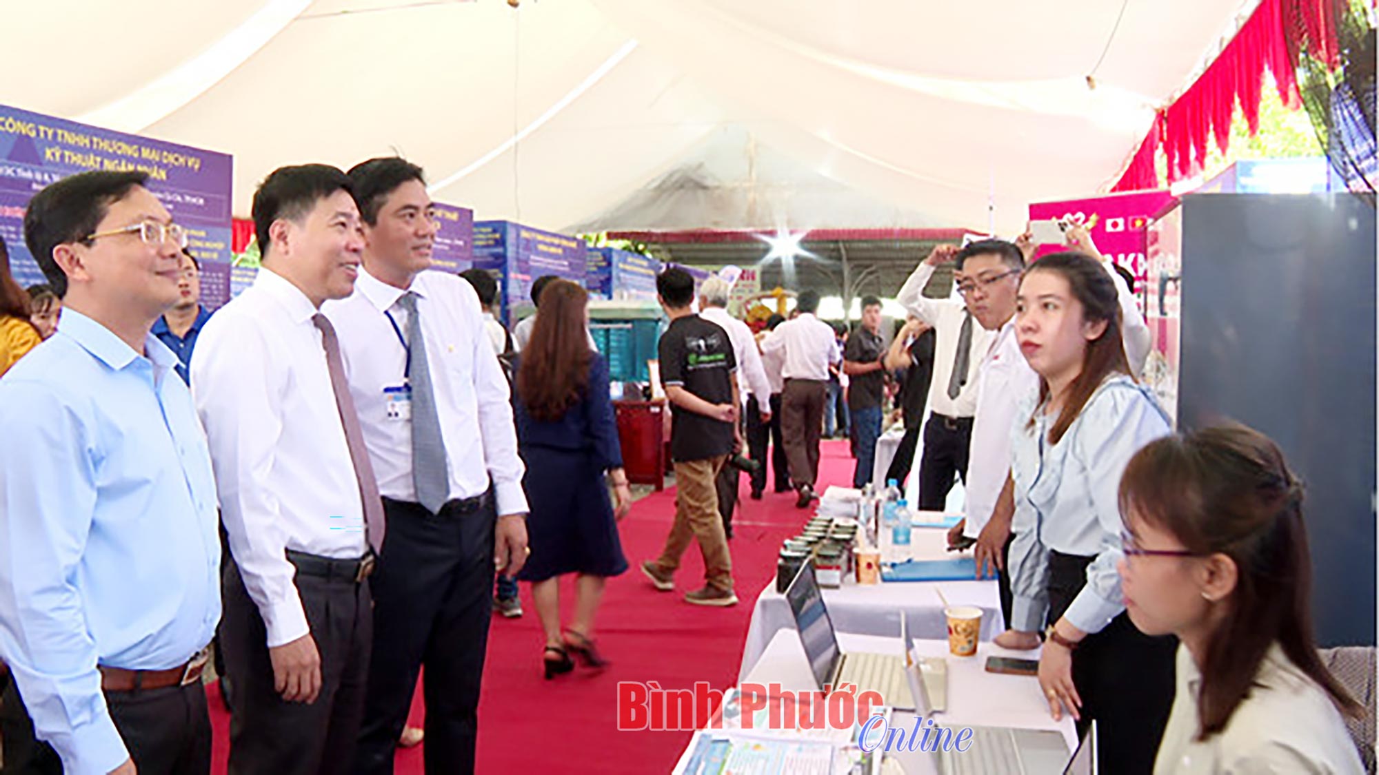Ủy viên Trung ương Đảng, Bí thư Tỉnh ủy Nguyễn Mạnh Cường (thứ 2 từ trái qua) thăm các sản phẩm trưng bày tại Sàn giao dịch công nghệ và thiết bị tỉnh Bình Phước trong ngày khai trương 30-5-2022