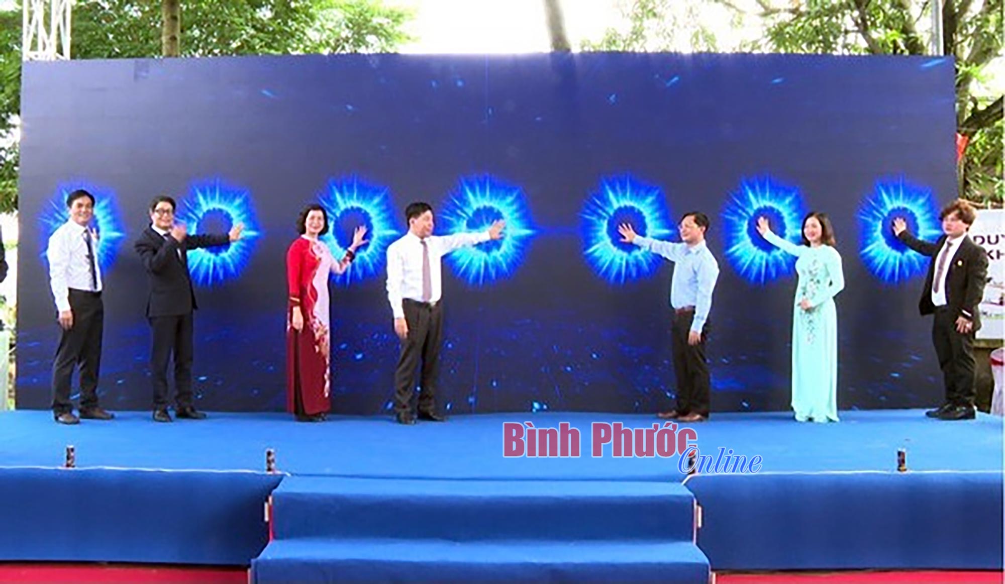 Ông Nguyễn Mạnh Cường, Phó Cục trưởng phụ trách Cục công tác phía Nam, Bộ Khoa học và Công nghệ (thứ 2 từ trái qua) cùng lãnh đạo tỉnh Bình Phước nhấn nút khai trương Sàn giao dịch công nghệ và thiết bị tỉnh Bình Phước ngày 30-5-2022