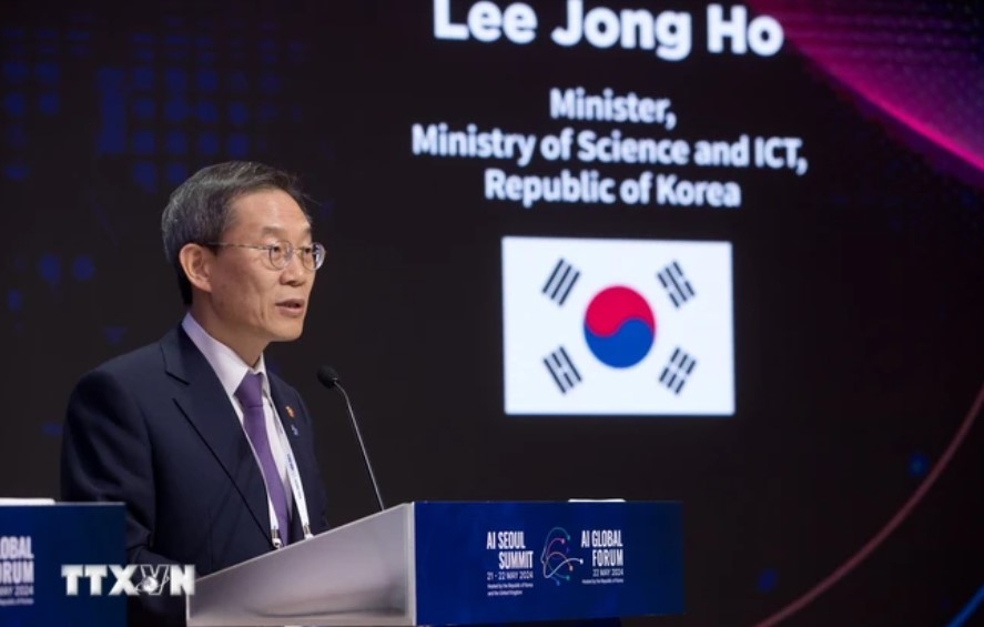 Bộ trưởng Bộ Khoa học Công nghệ Thông tin-Truyền thông Hàn Quốc Lee Jong Ho tại Hội nghị thượng đỉnh toàn cầu về trí tuệ nhân tạo ở Hàn Quốc ngày 22-4-2024. (Ảnh: Đức Thắng/ TTXVN)