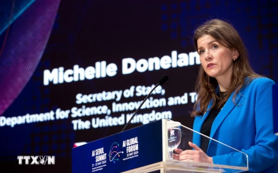 Bộ trưởng Khoa học Đổi mới-Công nghệ của Vương quốc Anh Michelle Donelan và Bộ trưởng Bộ Khoa học Công nghệ Thông tin-Truyền thông Hàn Quốc Lee Jong Ho tại Hội nghị thượng đỉnh toàn cầu về trí tuệ nhân tạo ở Hàn Quốc ngày 22-4-2024. (Ảnh: Đức Thắng/ TTXVN)