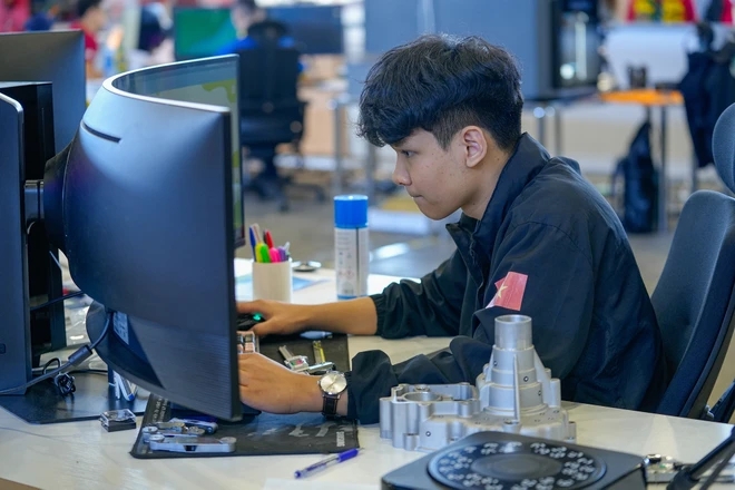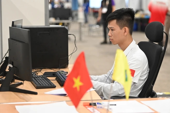 Thí sinh Nguyễn Khoa Hải Minh tại kỳ thi Kỹ năng nghề thế giới lần thứ 47. (Ảnh: PV/Vietnam+)