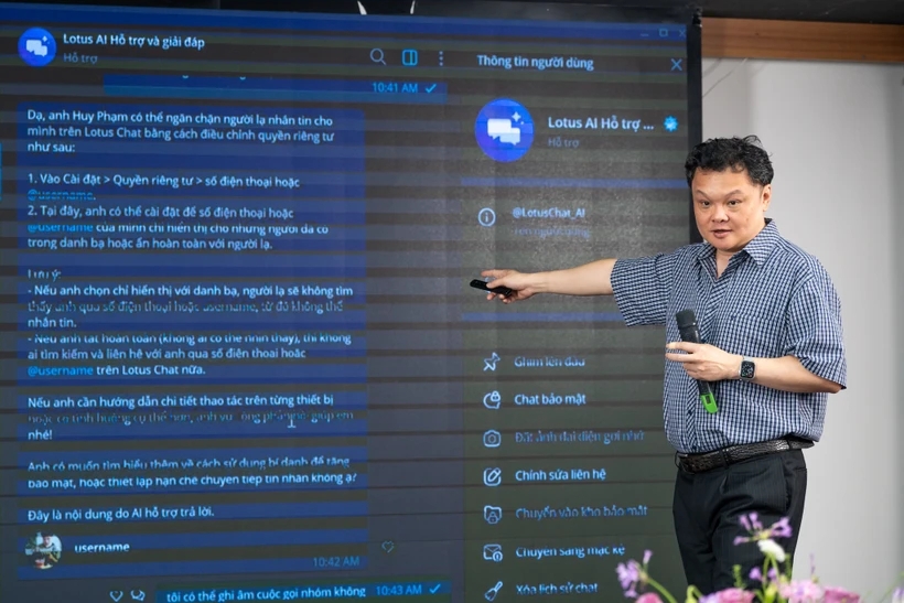 Ông Nguyễn Thế Tân - Tổng giám đốc VCCorp, Giám đốc sản phẩm Lotus Chat đã chia sẻ nhiều tính năng mới của Lotus Chat. (Ảnh: Minh Sơn/Vietnam+)