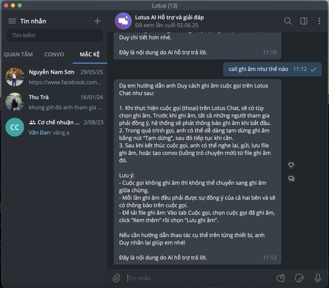 Demo việc tích hợp AI vào trong Lotus Chat. (Ảnh chụp màn hình)