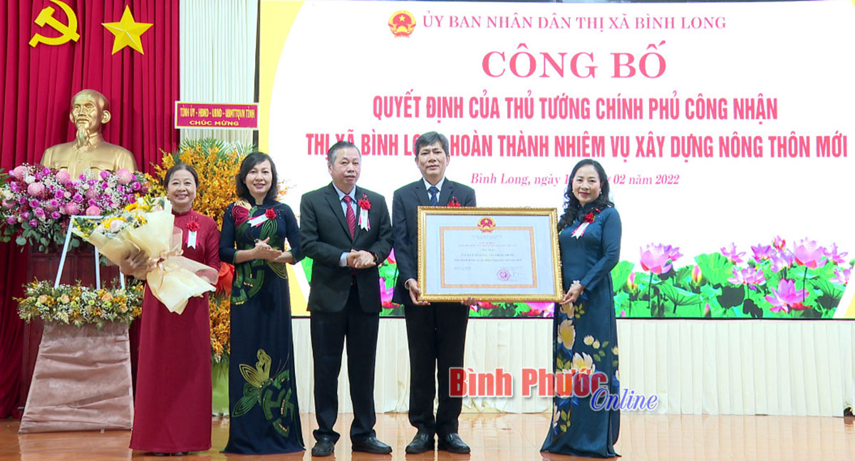 Thị xã Bình Long hoàn thành xây dựng nông thôn mớiBPO - Sau 10 năm nỗ lực, chung sức đồng lòng của cả hệ thống chính trị và nhân dân trong thực hiện phong trào thi đua “Cả nước chung sức xây dựng nông thôn mới” giai đoạn 2011-2021, ngày 21-9-2021, Thủ tướng Chính phủ ban hành quyết định về việc công nhận thị xã Bình Long, tỉnh Bình Phước hoàn thành nhiệm vụ xây dựng nông thôn mới (NTM) năm 2020.