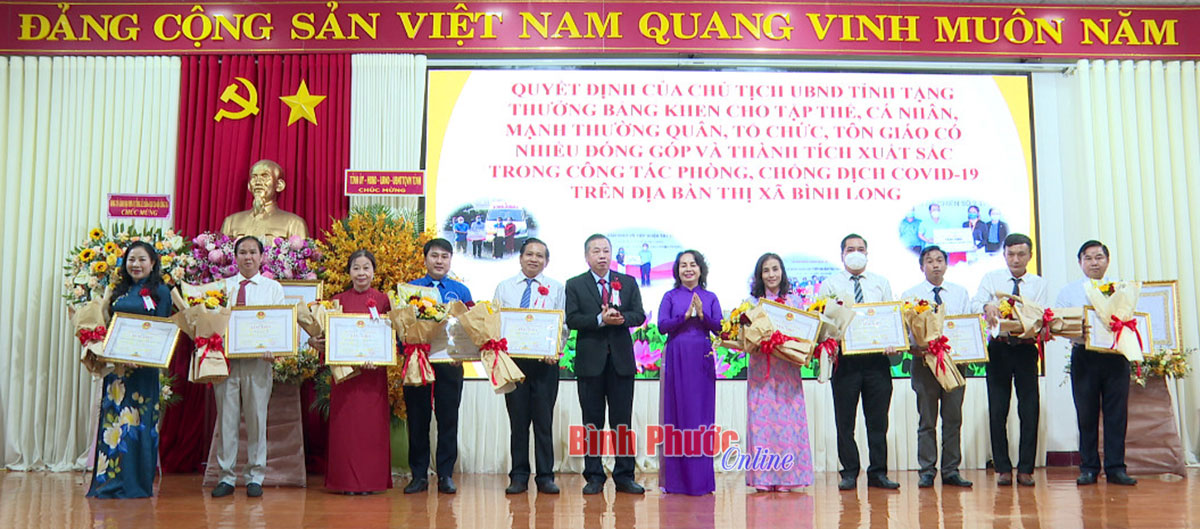 Các tập thể, cá nhân, doanh nghiệp, mạnh thường quân, tổ chức tôn giáo có nhiều đóng góp và thành tích xuất sắc trong công tác phòng chống dịch Covid-19 trên địa bàn thị xã Bình Long nhận bằng khen của Chủ tịch UBND tỉnh