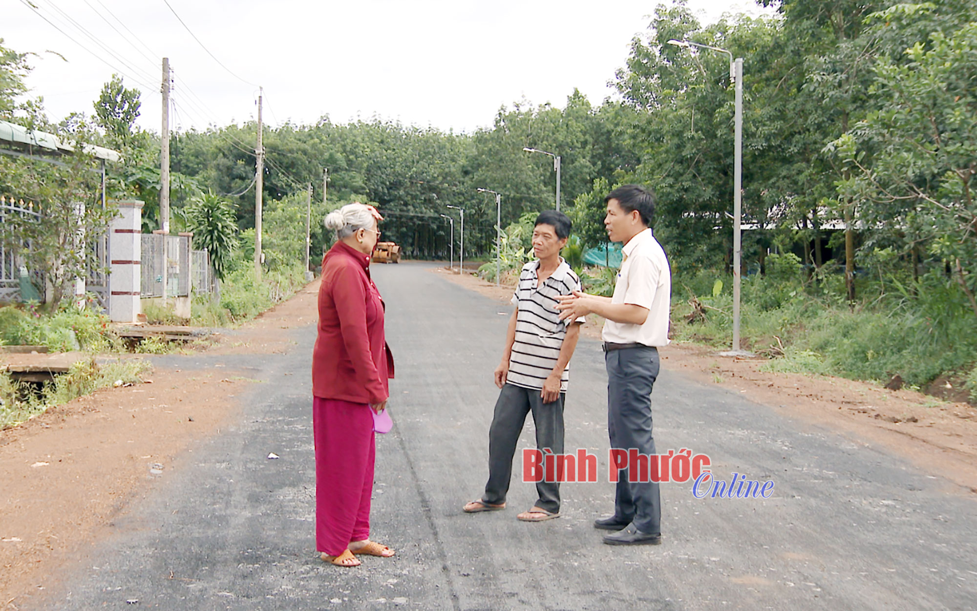 Chủ tịch UBND xã Phước Thiện Nguyễn Đức Thắng trao đổi với người dân ấp Mười Mẫu về triển khai thi công các tuyến đường trên địa bàn