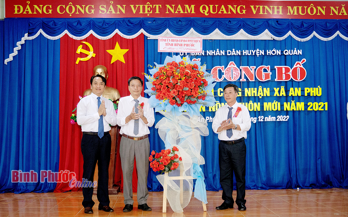 Thay mặt Tỉnh ủy, HĐND, UBND, UBMTTQVN tỉnh, Phó Giám đốc Sở Văn hóa, Thể thao và Du lịch Đỗ Minh Trung tặng lẵng hoa chúc mừng xã An Phú đạt chuẩn nông thôn mới