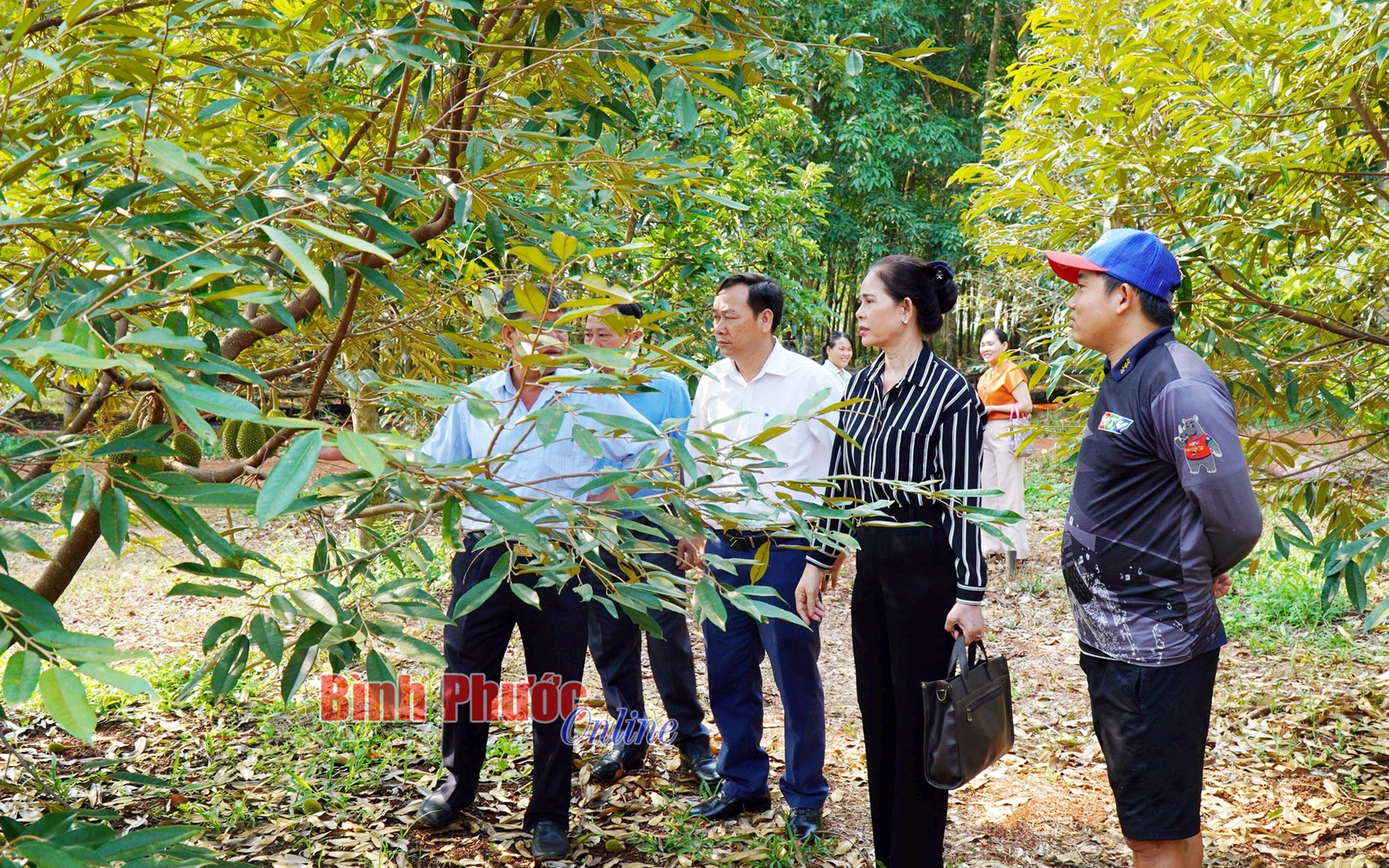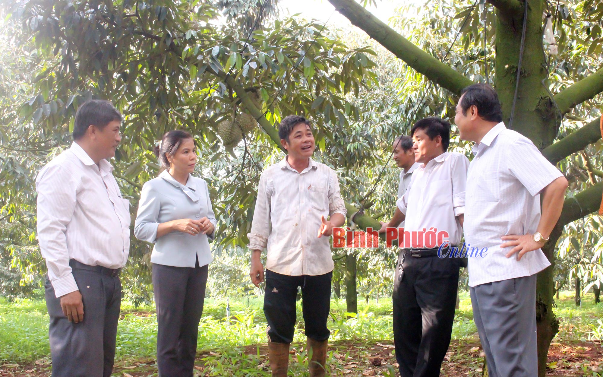 Thời gian qua, phong trào nông dân sản xuất, kinh doanh giỏi lan tỏa mạnh mẽ trên địa bàn huyện Phú Riềng, đóng góp vào quá trình phát triển địa phương. Trong ảnh: Lãnh đạo huyện thăm mô hình trồng sầu riêng của thành viên Hợp tác xã cây ăn trái Tiến Thịnh, xã Phước Tân