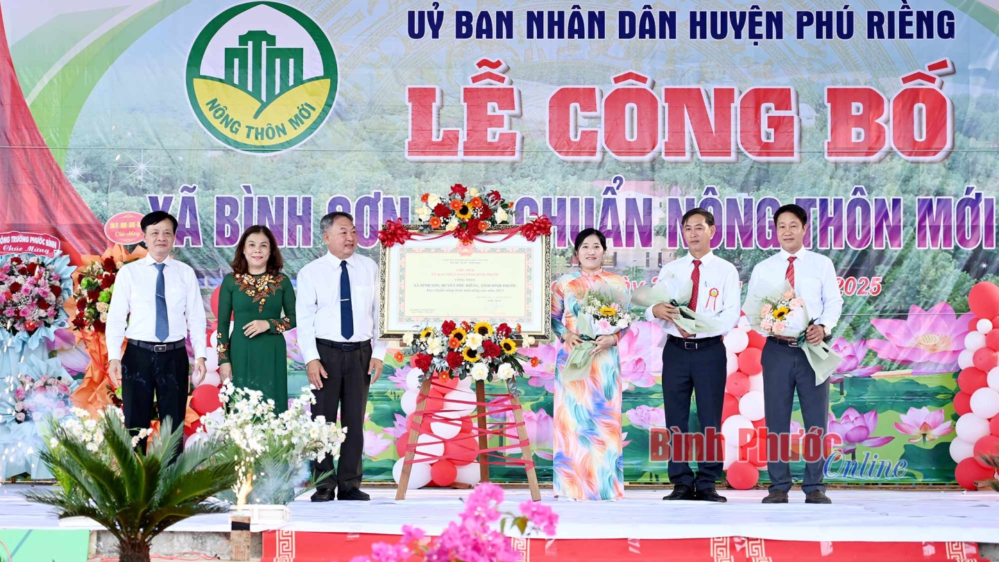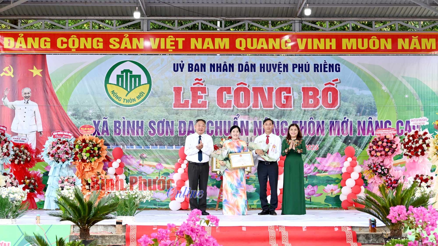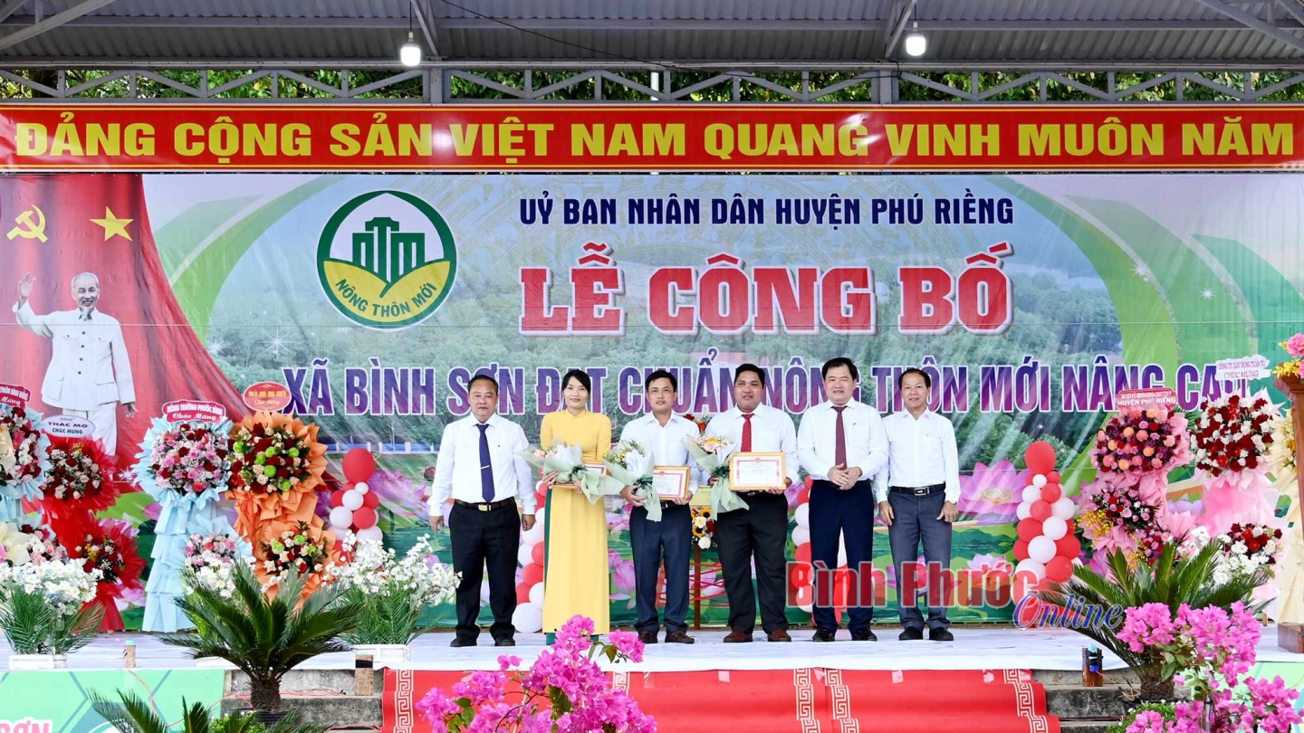 Phát biểu tại buổi lễ, Phó Chủ tịch UBND huyện Phú Riềng Lê Văn Chung cho biết: Bình Sơn là xã thứ 4 của huyện Phú Riềng được UBND tỉnh công nhận đạt chuẩn nông thôn mới nâng cao. Đây là niềm vinh dự, tự hào của Đảng bộ, chính quyền và nhân dân huyện nói chung và của xã Bình Sơn nói riêng. Cùng với đó tin tưởng, Đảng bộ, chính quyền và nhân dân xã Bình Sơn sẽ tiếp tục đoàn kết, sáng tạo, nỗ lực đạt nhiều thành tích xuất sắc hơn nữa, xây dựng Bình Sơn ngày càng giàu đẹp, đóng góp quan trọng vào sự phát triển bền vững của huyện.
