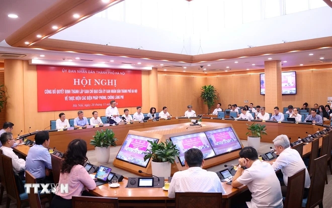 Hội nghị công bố Quyết định thành lập Ban Chỉ đạo của Ủy ban Nhân dân thành phố Hà Nội về thực hiện các biện pháp phòng, chống lãng phí. (Ảnh: Văn Điệp/TTXVN)