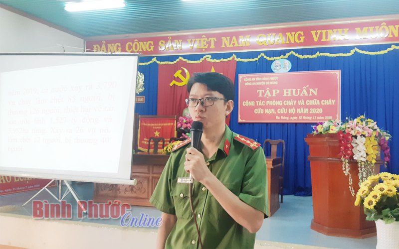 Bù Đăng: 300 người tham gia tập huấn công tác phòng cháy, chữa cháyBPO - Sáng nay 12-11, Công an huyện Bù Đăng phối hợp với Phòng Cảnh sát phòng cháy chữa cháy - cứu nạn cứu hộ, Công an tỉnh Bình Phước khai mạc lớp tập huấn về công tác phòng cháy, chữa cháy cho 300 cán bộ, chiến sĩ lực lượng tự vệ khối cơ quan Nhà nước, nông lâm trường và các hộ kinh doanh trên địa bàn huyện.