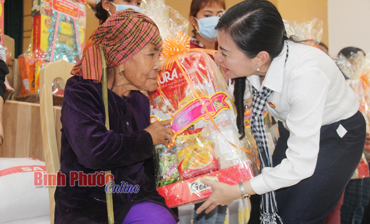 Bà Phan Kiều Thanh Hương, Phó chủ tịch Ủy ban MTTQ Việt Nam TP. Hồ Chí Minh trao quà tết cho người nghèo xã Phú Văn, huyện Bù Gia Mập