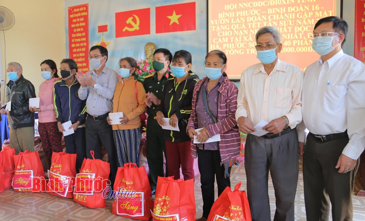 Đại diện Hội Nạn nhân chất độc da cam/dioxin tỉnh, Ban Dân vận Tỉnh ủy và Binh đoàn 16 tặng quà cho các hộ nạn nhân chất độc da cam/dioxin