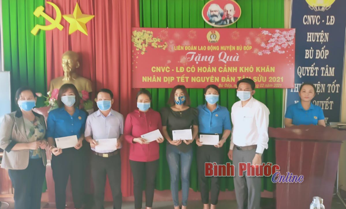 Nhân dịp Tết Nguyên đán Tân Sửu 2021, LĐLĐ huyện đã trao tặng 95 phần quà (500 ngàn đồng/phần) từ nguồn kinh phí vận động LĐLĐ tỉnh và các mạnh thường quân trên địa bàn huyện. Trong đó bà Cao thị Hồng Mận, Trưởng Ban Dân vận, Chủ tịch Ủy ban MTTQ Việt Nam huyện hỗ trợ 25 phần quà.
