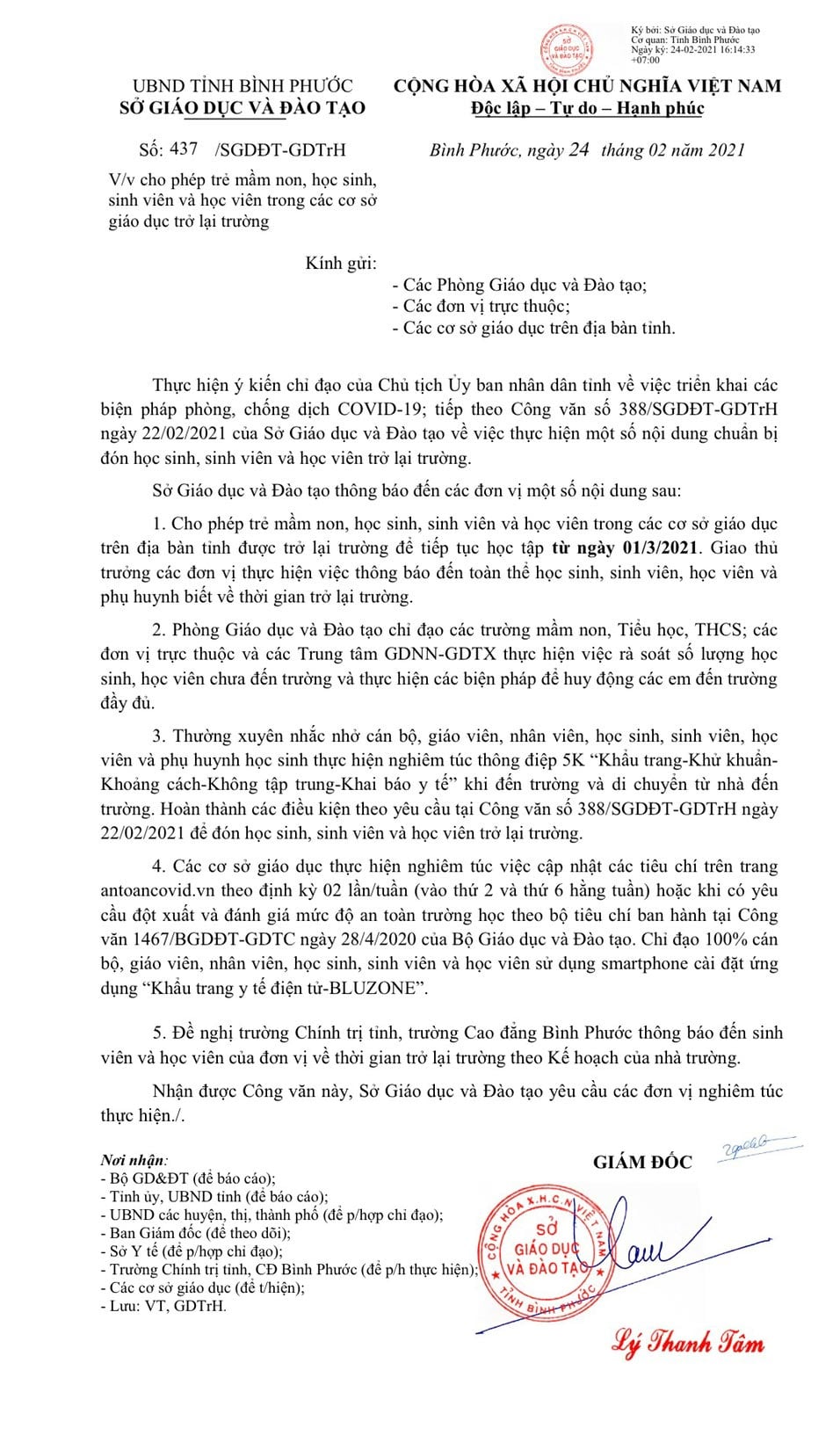 Bên cạnh đó, thường xuyên nhắc nhở cán bộ, giáo viên, nhân viên, học sinh, sinh viên, học viên và phụ huynh học sinh thực hiện nghiêm thông điệp 5K khi đến trường và di chuyển từ nhà đến trường. Các cơ sở giáo dục chỉ đạo 100% cán bộ, giáo viên, nhân viên, học sinh, sinh viên và học viên sử dụng smartphone cài đặt ứng dụng Bluezone.