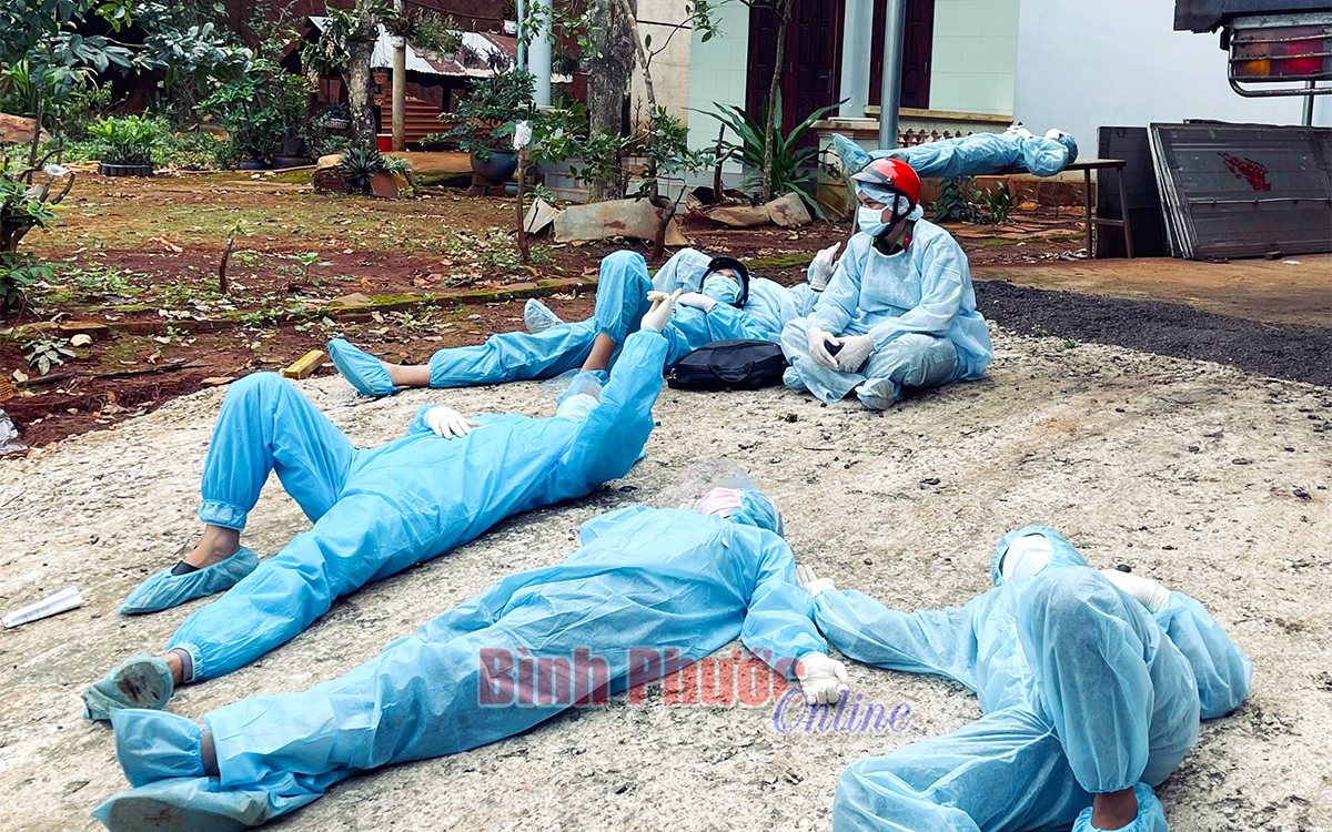 Các thành viên Đội phản ứng nhanh Trung tâm y tế huyện Bù Đăng mệt mỏi sau một đêm trắng truy vết F1, F2, F3