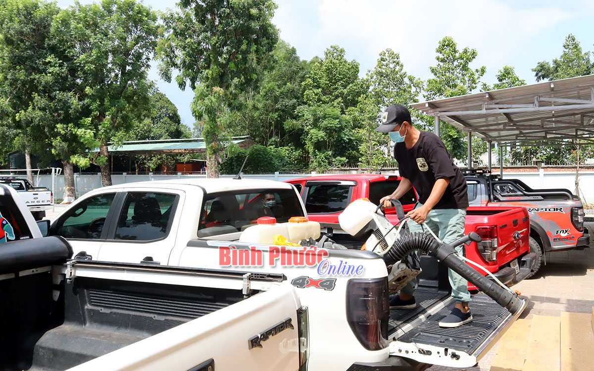 Đội xe bán tải tình nguyện hỗ trợ đội phản ứng nhanh thành phố trong vận chuyển máy phun khử khuẩn