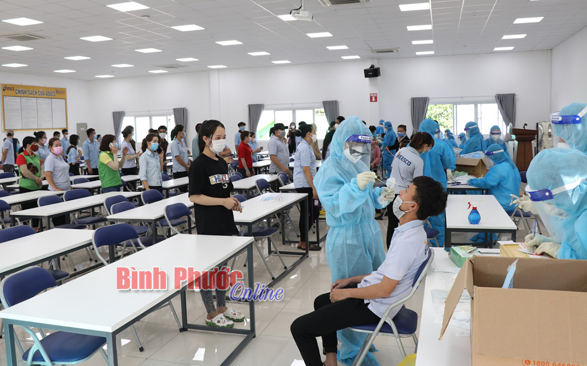Cán bộ, nhân viên y tế lấy mẫu xét nghiệm cho công nhân tại Khu công nghiệp Chơn Thành