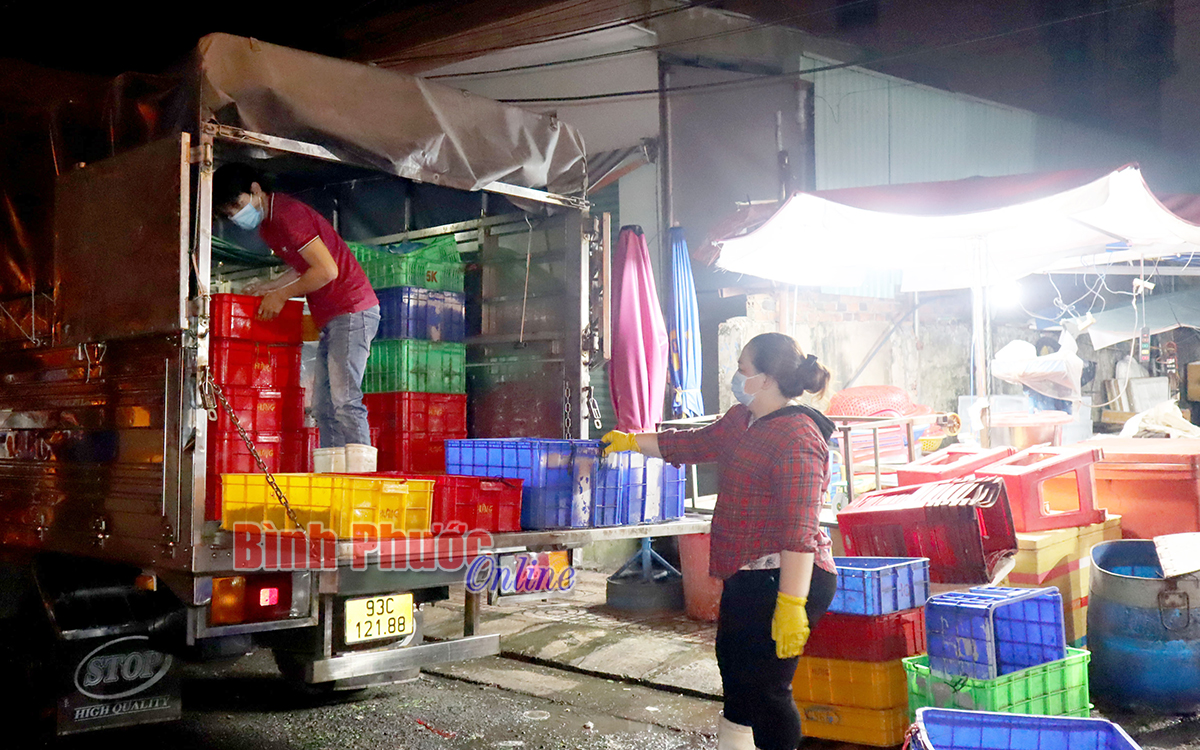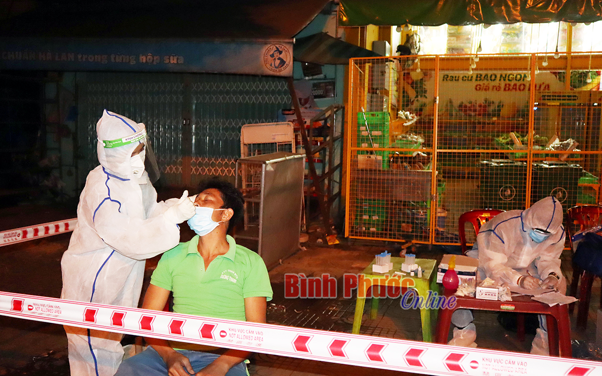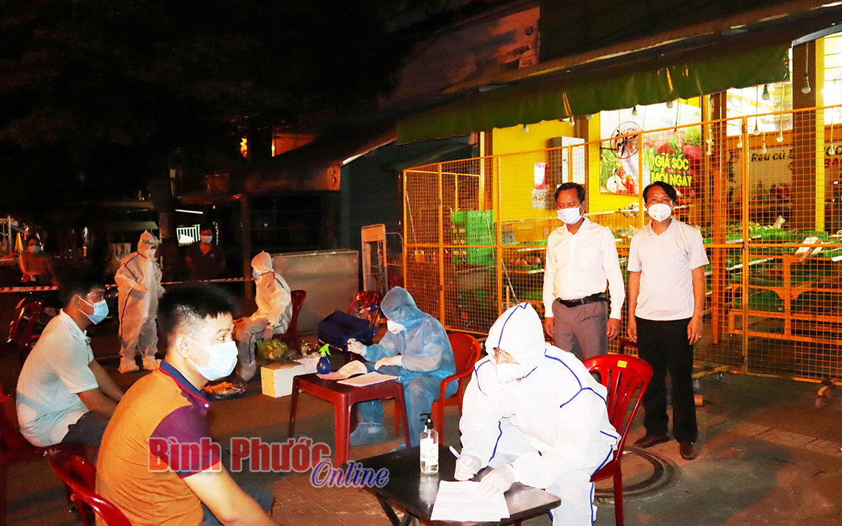 UBND phường Tân Bình và Ban quản lý chợ Đồng Xoài đã phối hợp bố trí lực lượng chốt ở các điểm bỏ hàng của các xe vận chuyển từ chợ đầu mối về khu vực chợ Đồng Xoài để yêu cầu các tài xế xe, phụ xe thực hiện khai báo y tế và lấy mẫu xét nghiệm SARS-CoV-2.