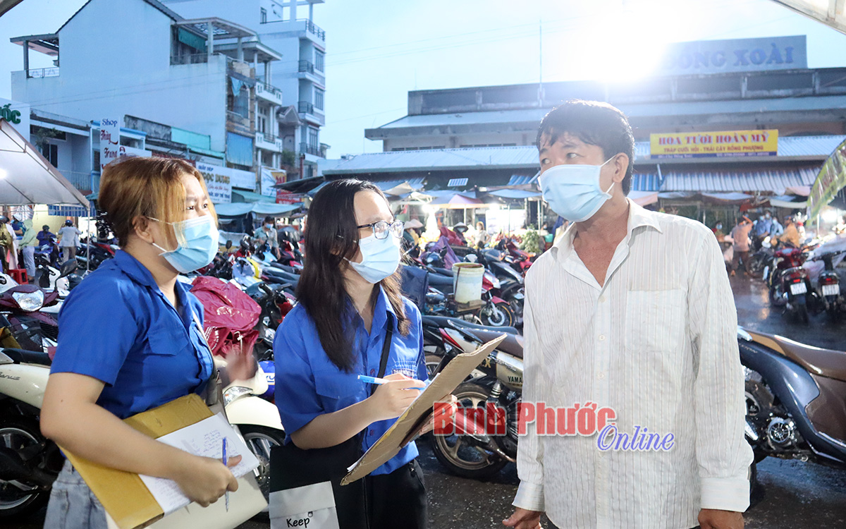 Lực lượng đoàn viên thanh niên thành phố Đồng Xoài hỗ trợ việc lấy danh sách tiểu thương chợ Đồng Xoài