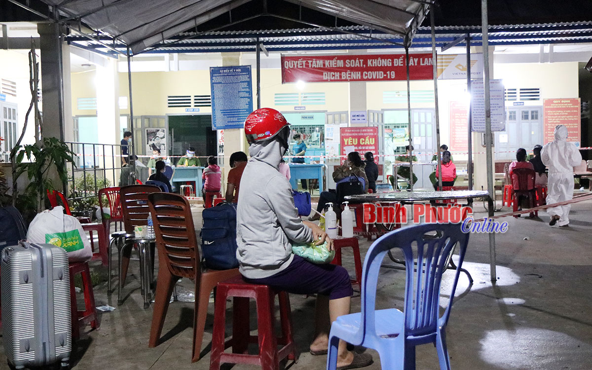 Tại trạm y tế xã Minh Thành, lực lượng chức năng đưa các trường hợp F1 đi cách ly tập trung ngay trong đêm. Ảnh chụp lúc 2 giờ sáng ngày 9-7-2021.
