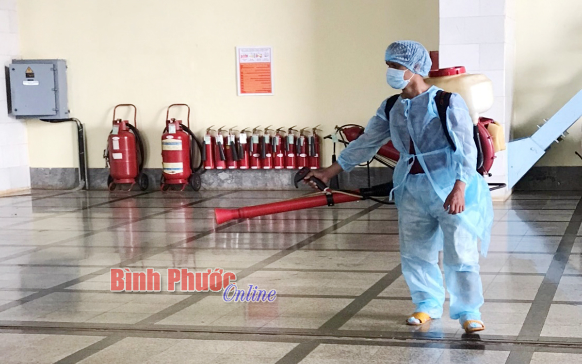 Cán bộ Trung tâm Y tế thị xã Phước Long phun thuốc khử khuẩn tại nhà máy