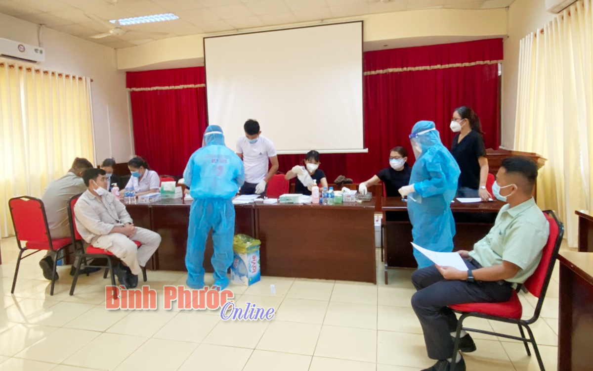 Cán bộ Trung tâm Y tế thị xã Phước Long triển khai lấy mẫu xét nghiệm cho cán bộ, công nhân viên công ty