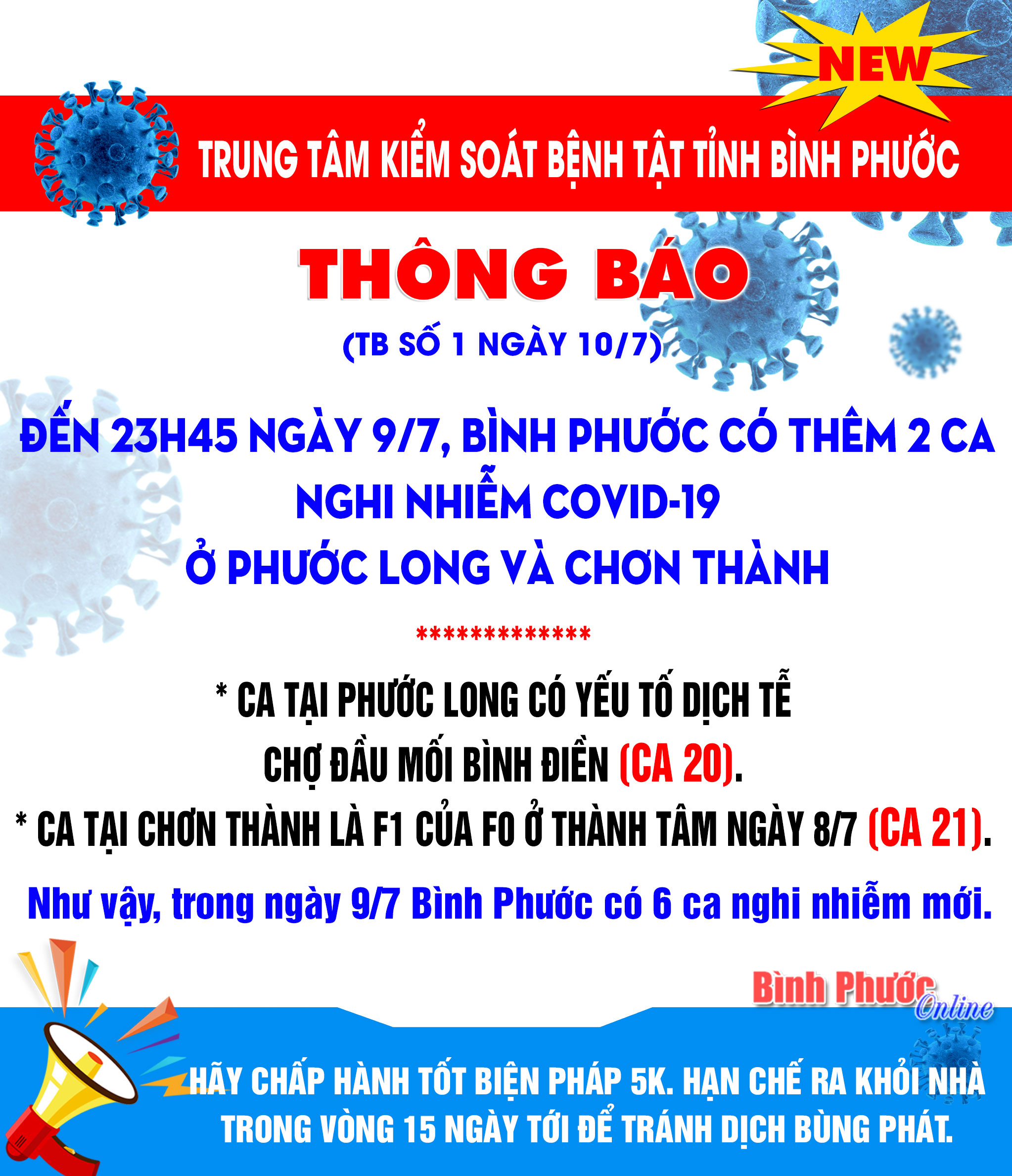 Từ ngày 1 đến 9-7-2021, ca nhiễm có mặt tại các địa điểm: Chợ Phước Tín, thị xã Phước Long từ 5 đến 9 giờ.