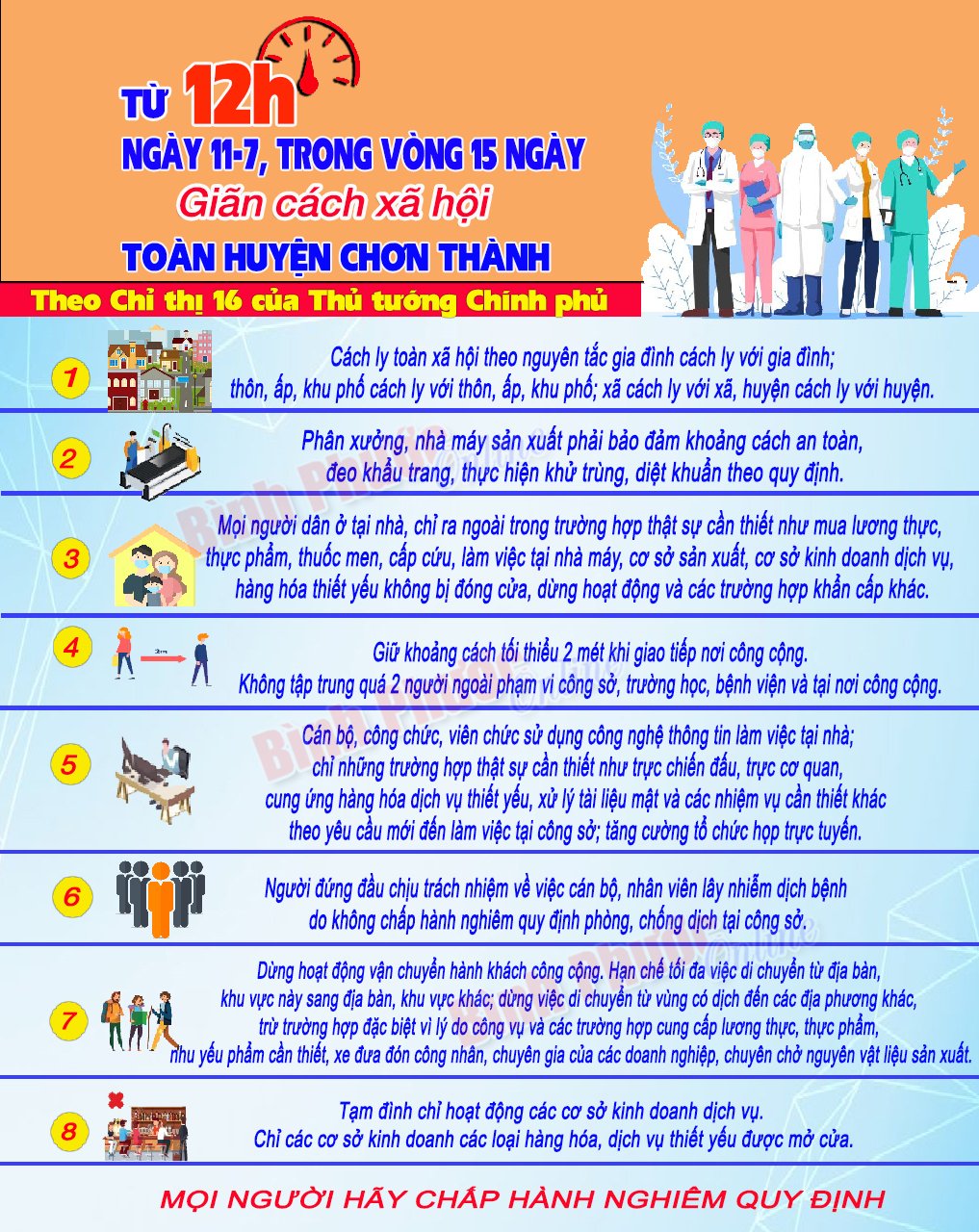 Báo cáo của Ban chỉ đạo phòng, chống dịch Covid-19 huyện Chơn Thành cho biết, huyện đã triển khai chỉ thị đến các xã, thị trấn; đồng thời tổ chức tuyên truyền tại các xã, thị trấn, chợ, khu công nghiệp để người dân nắm rõ chủ trương để thực hiện tốt.