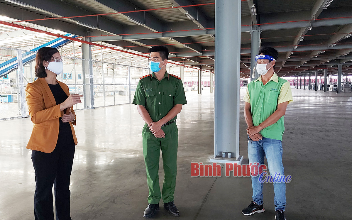 Phó chủ tịch UBND tỉnh Trần Tuyết Minh cũng đi kiểm tra khu cách ly tập trung tại Công ty TNHH Beesco Vina, Khu công nghiệp Chơn Thành 2, nơi đang có 34 trường hợp F1 là công nhân công ty đang cách ly theo dõi sức khỏe.