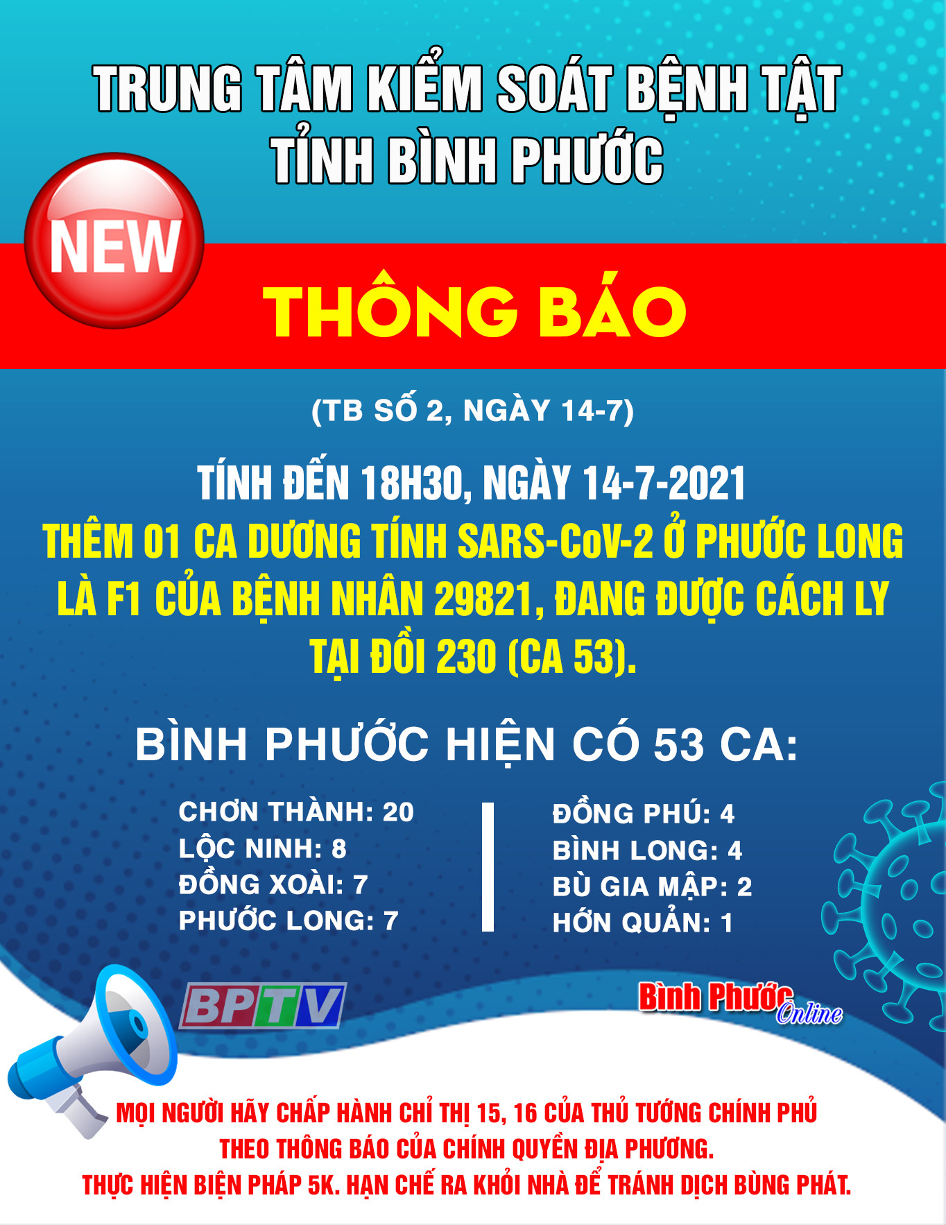 Trung tâm Kiểm soát bệnh tật tỉnh Bình Phước vừa thông báo, tính đến 18 giờ 30 phút hôm nay (14-7), Bình Phước có thêm 1 ca dương tính SARS-CoV-2 tại Phước Long, là F1 của bệnh nhân 29821, đang được cách ly tại đồi 230 (ca 53). Bình Phước hiện có 53 ca, trong đó: Chơn Thành 20, Lộc Ninh 8, Đồng Xoài 7, Phước Long 7, Đồng Phú 4, Bình Long 4, Bù Gia Mập 2, Hớn Quản 1.