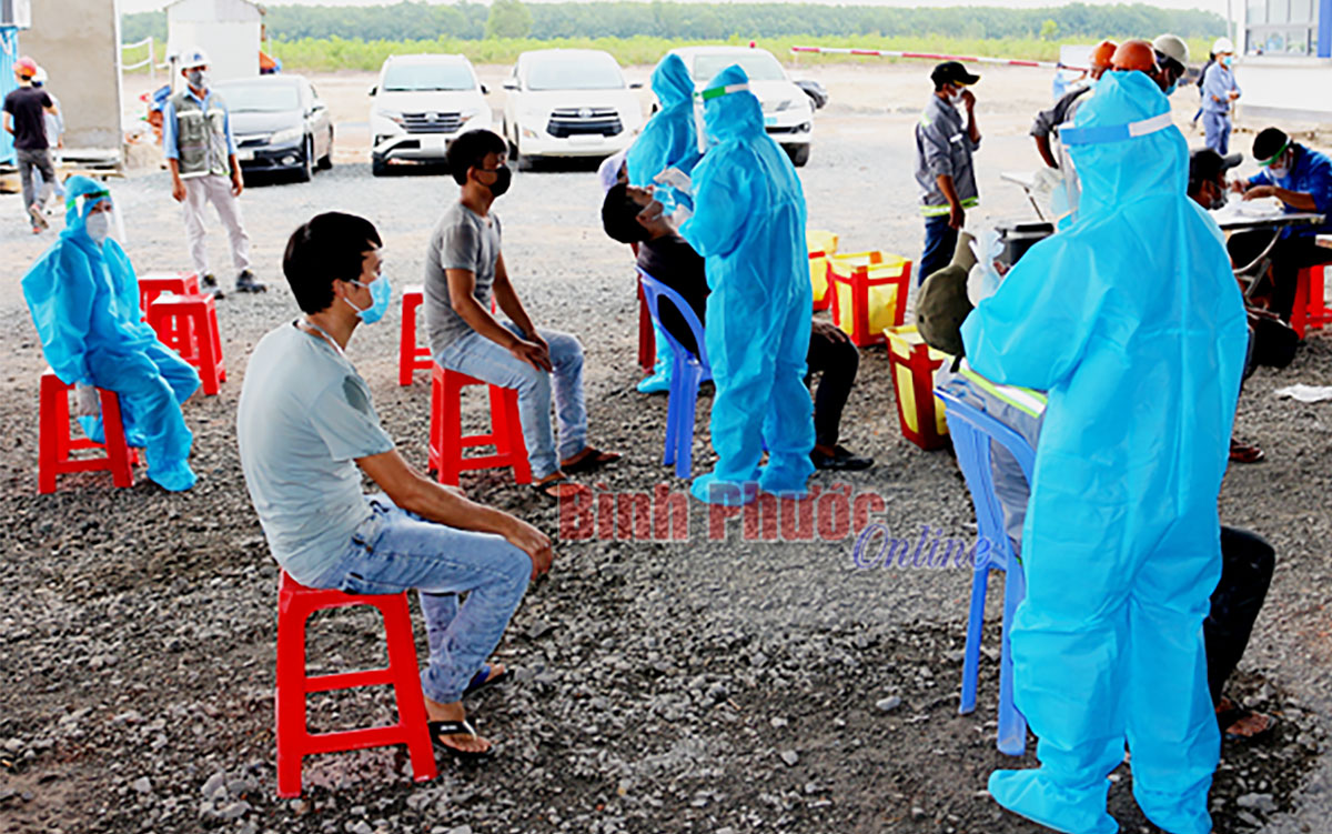 Sáng nay 15-7, đội lấy mẫu xét nghiệm Covid-19 huyện Hớn Quản (16 y, bác sĩ Trung tâm y tế và 4 đoàn viên tình nguyện xã Đồng Nơ) đã tiến hành lấy mẫu xét nghiệm sàng lọc SARS-CoV-2 cho công nhân lao động tại Khu công nghiệp Minh Hưng Sikiko.